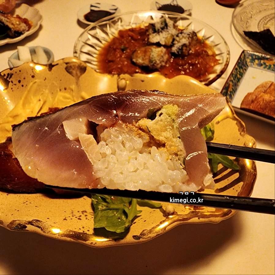 고등어봉초밥을 김을 싸머 먹으라고 하더라고요. 1인당 2조각씩 돌아가서 처음에는 그냥 먹고 다음에는 김을 싸먹었는데 둘다 너무 맛있었습니다. 고등어의 살짝 비릿한 그 맛이 너무 좋았고 생강과 잘 중화되면서 어우러져서 더욱 맛있었습니다.