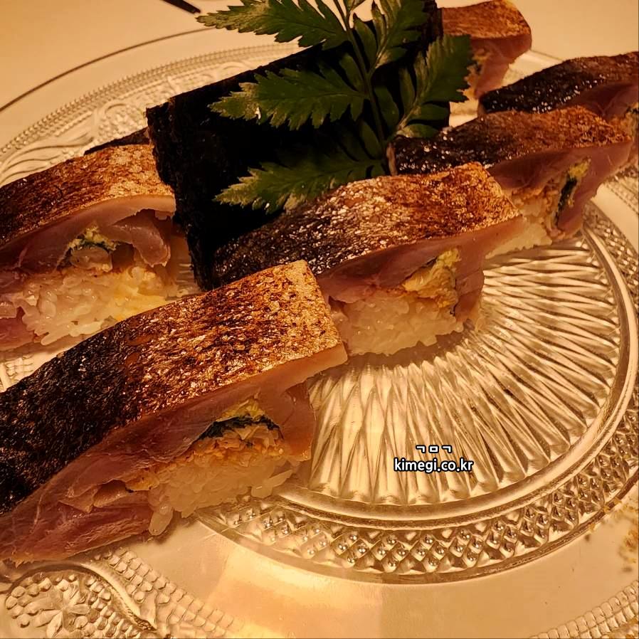 고등어봉초밥을 김을 싸머 먹으라고 하더라고요. 1인당 2조각씩 돌아가서 처음에는 그냥 먹고 다음에는 김을 싸먹었는데 둘다 너무 맛있었습니다. 고등어의 살짝 비릿한 그 맛이 너무 좋았고 생강과 잘 중화되면서 어우러져서 더욱 맛있었습니다.