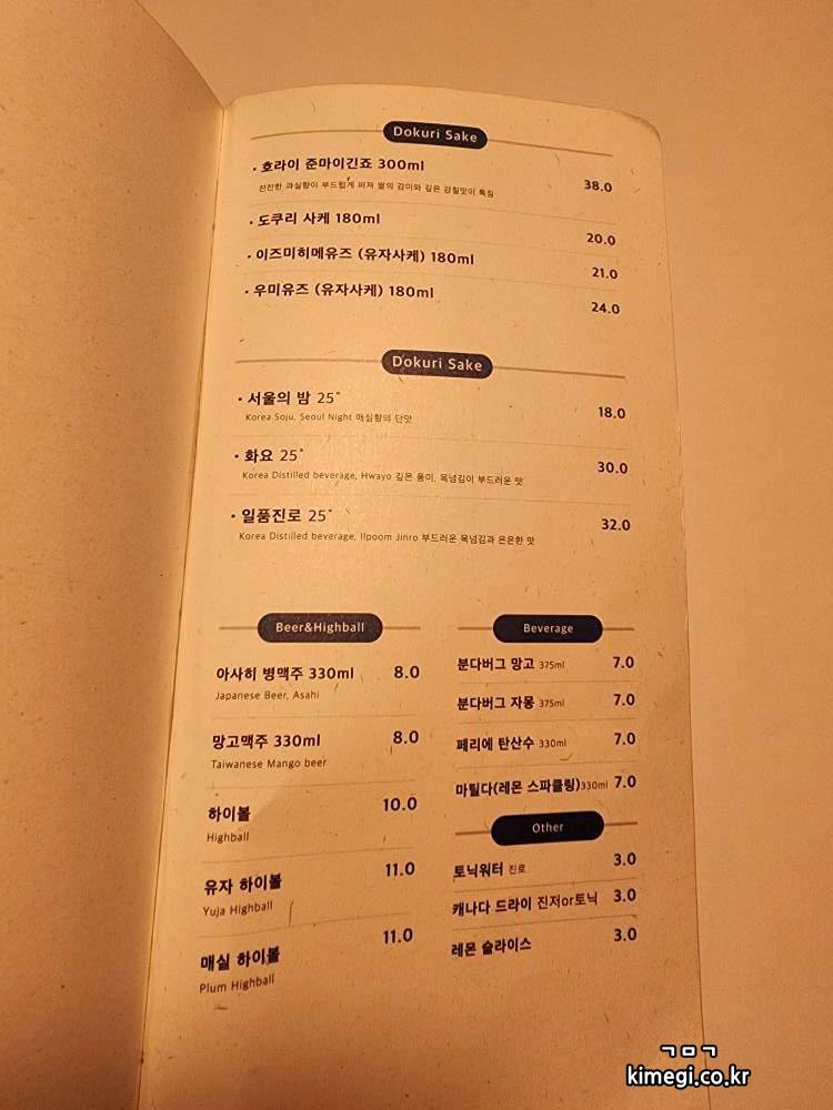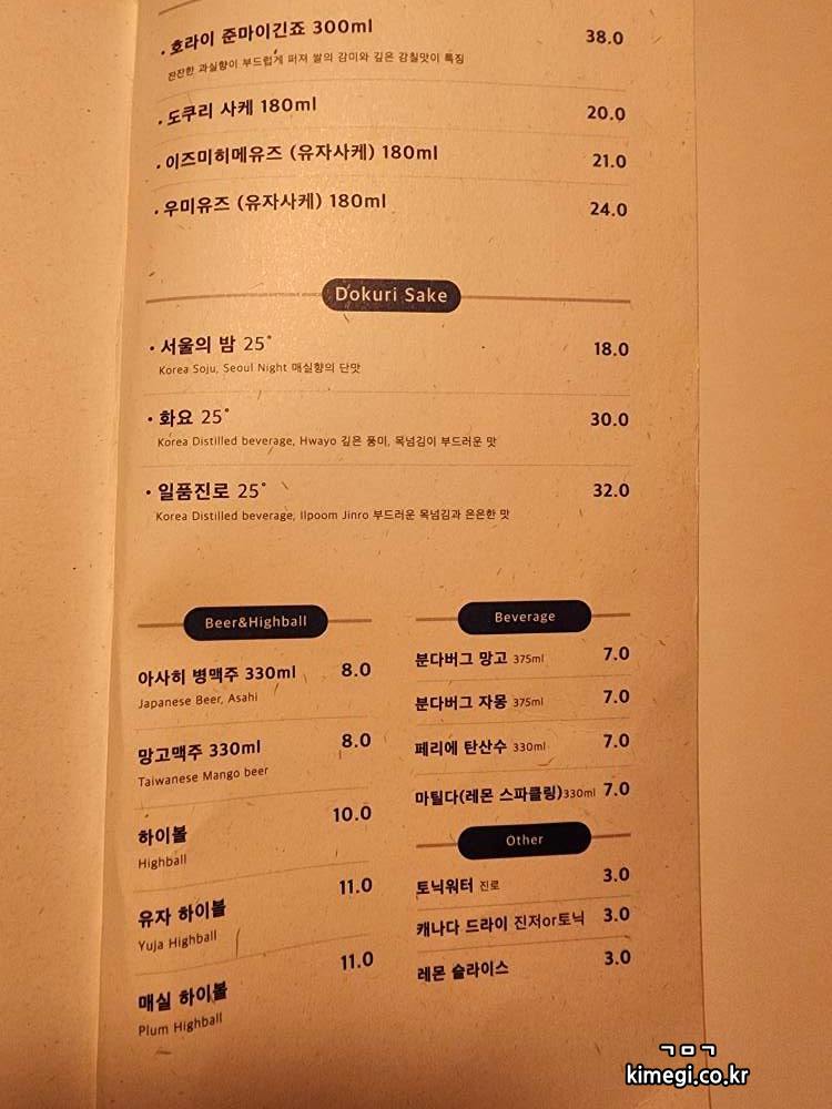 술은 소주는 안팔고 와인이나 사케 등등을 판매하고 있어요. 술을 많이 먹진 않을 거라 가볍게 서울의밤 한병과 분다버그 망고를 주문해서 마셨습니다.