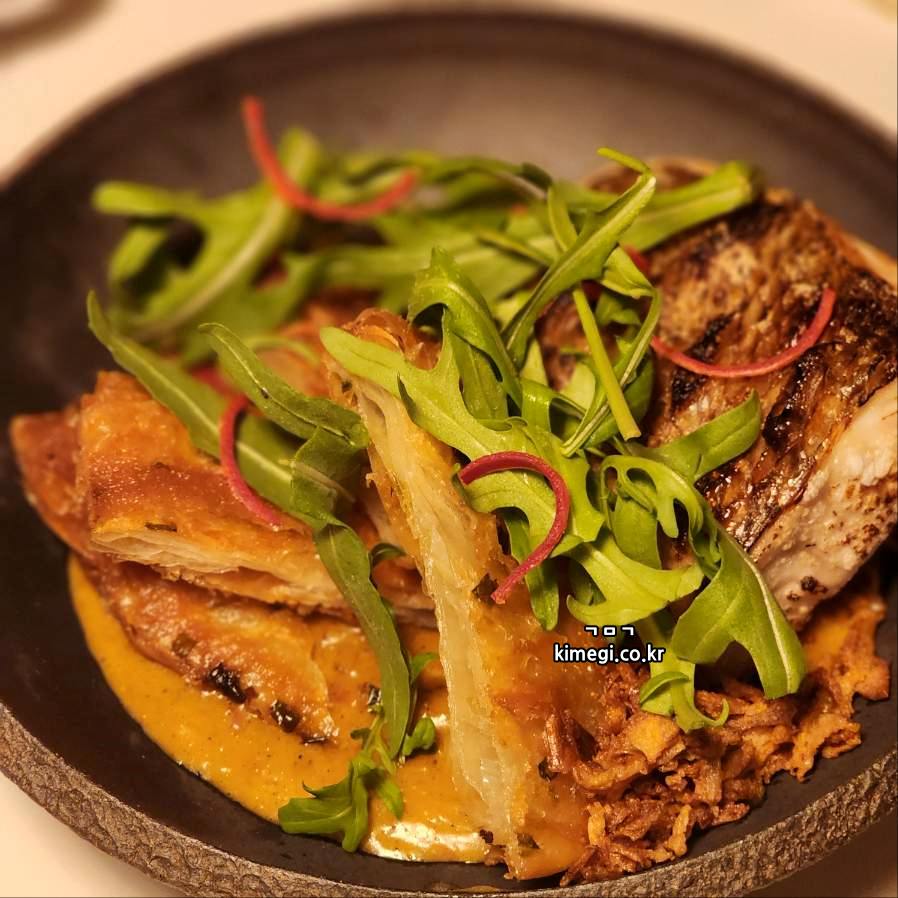 도미마라입니다. 가격은 24,000원으로 도미를 생각보다 저렴한 가격에 먹을 수 있는 것 같아요. 새우를 갈아 만든 모스와 잘 구워진 도미가 나옵니다. 그리고 얇은 패스츄리 같은 빵도 나오는데 생각보다 너무 잘 어울렸어요.