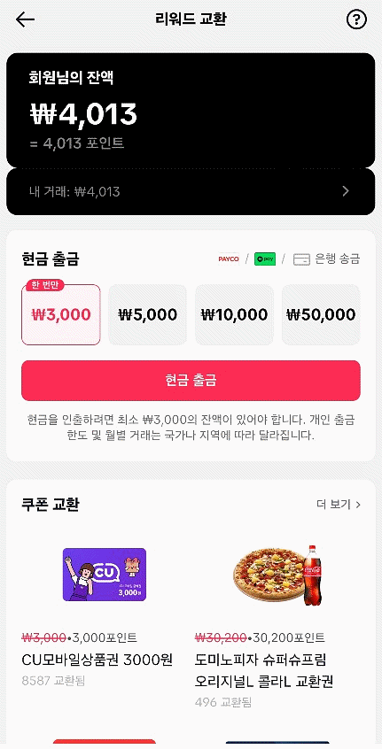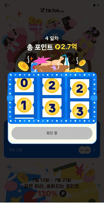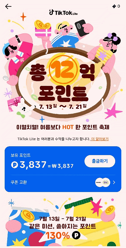 1주일 이용했는데 4천원을 모았어요. 그냥 유튜브 쇼츠 보는 대신 틱톡라이트만 봤는데도 돈이 금방 쌓이더라고요. 현금으로 출금해도 되고 쿠폰으로 교환하여 사용도 가능해요.