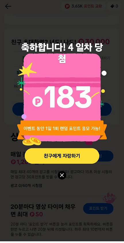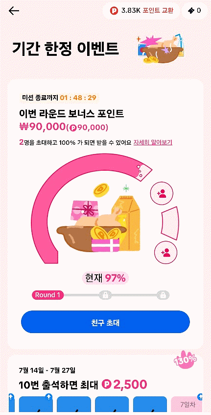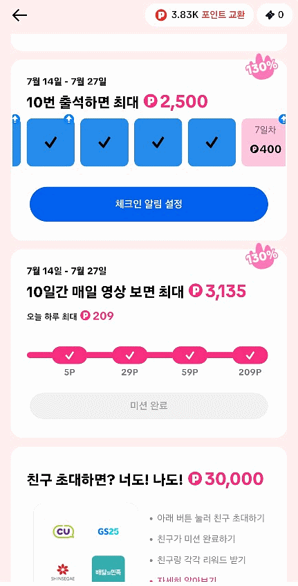 매일 출석하면 몇백원씩 포인트를 주고 10번 출석시 2,500원을 주고 있어요. 지금 이벤트 중이라 포인트를 훨씬 많이 주고 있으니까 빨리 참여해보세요.