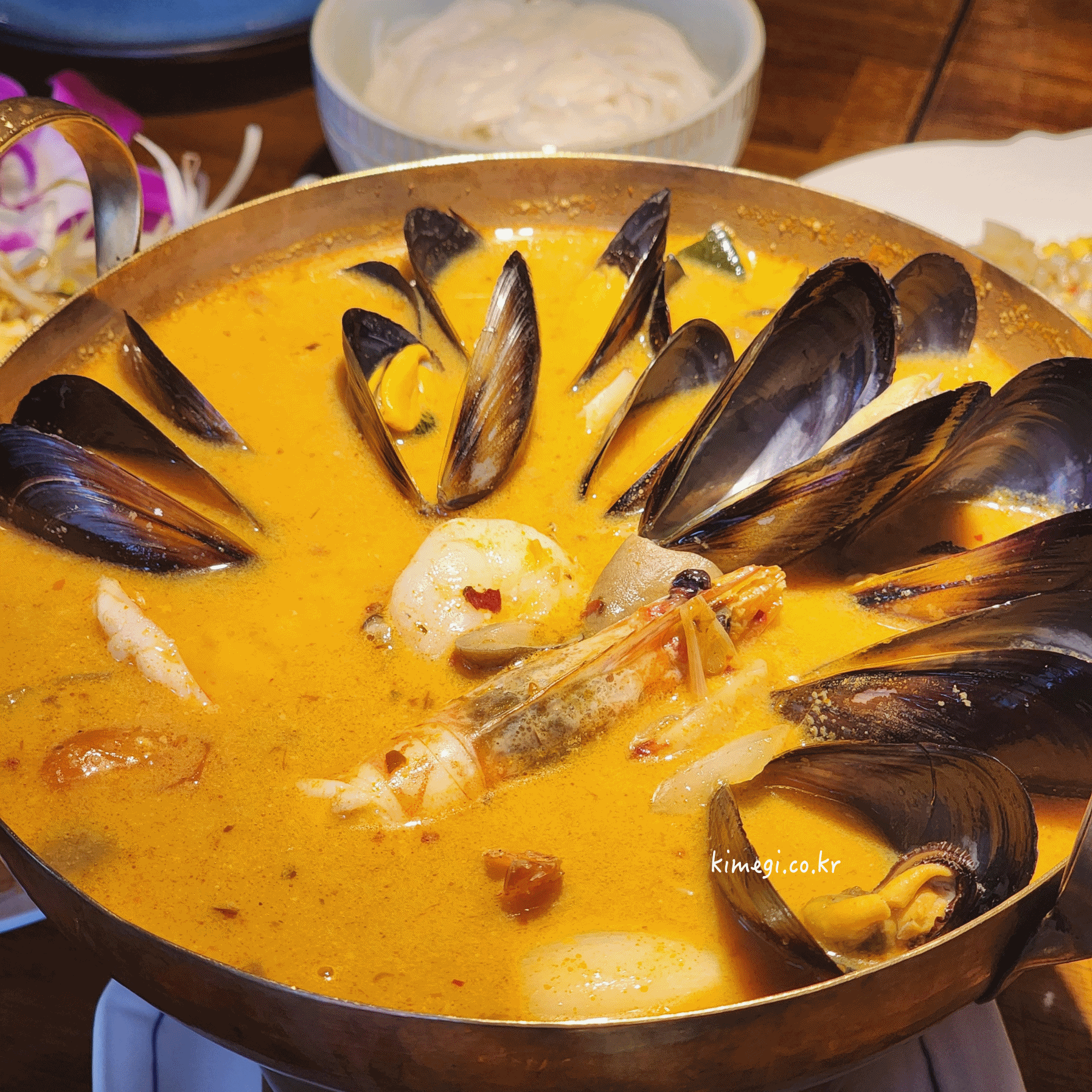 세계 3대 스프인 똠양꿍도 주문했습니다. 쌀국수 사리는 꼭 추가 필요합니다. 똠양꿍은 살짝 해산물이 조금 들어있었어요. 홍합과 오징어 새우가 들어있었는데 버섯이 너무 많이 들어있었어요. 하지만 스프 국물은 진짜 새콤하면서 너무 맛있었어요. 쌀국수를 말아서 함께 먹었을 때 너무 맛있습니다.
