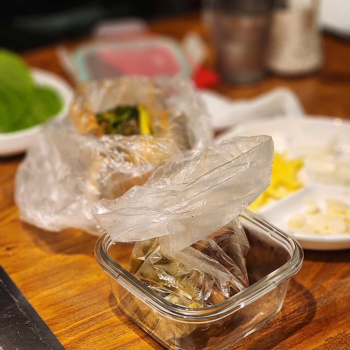 그리고 집에서 가져온 파긴치와 양파 절임을 함께 먹었어요. 파주 맛집 갈릴리농원 본점은 집에서 각종 반찬을 가지고 가서 함께 먹을 수 있어요. 친구에게 추천받아 갔는데 친구는 된장찌개도 끓여서 갔다고 하더라고요.