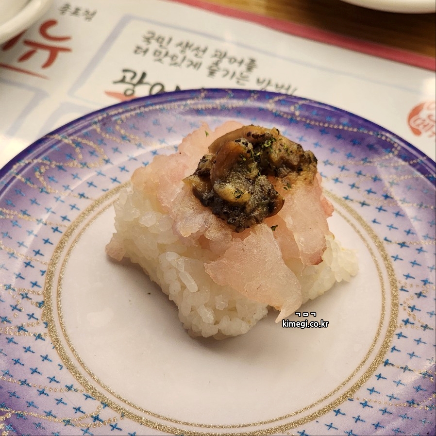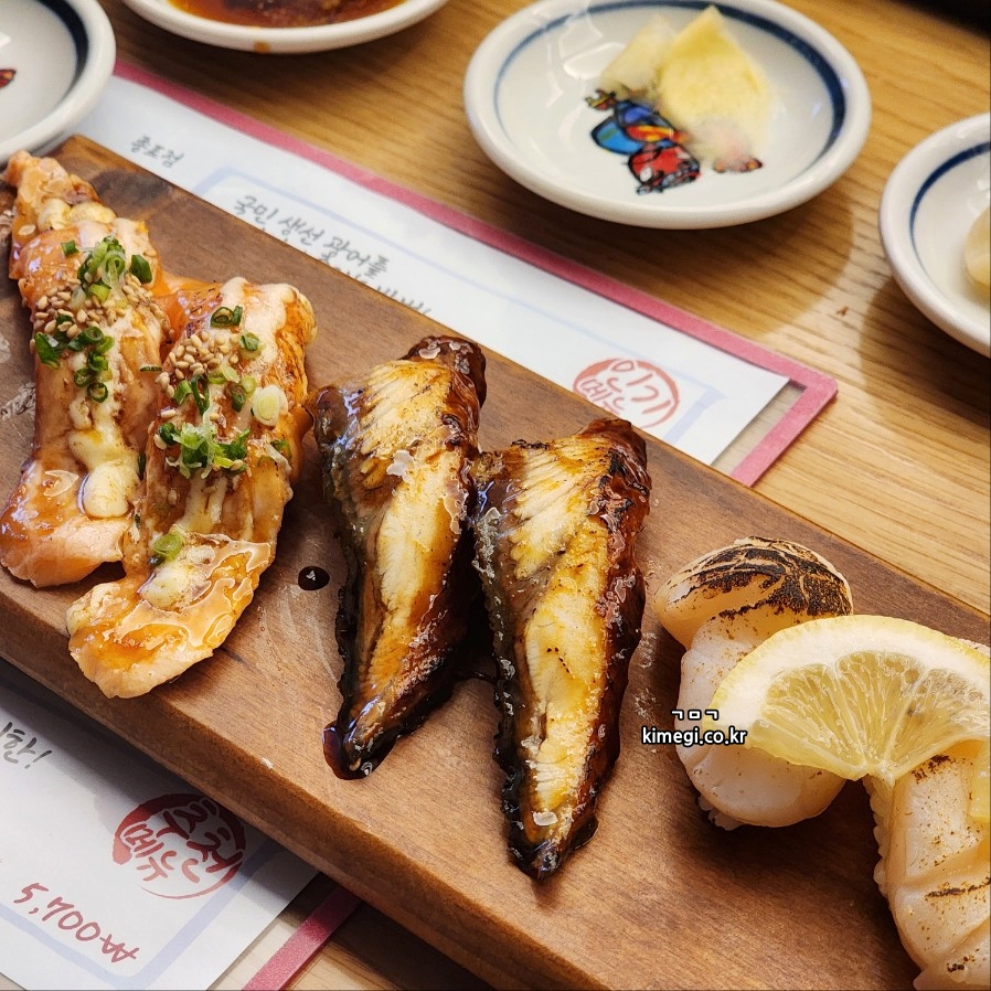 주문을 한 초밥은 동그란 접시가 아닌 네모난 접시에 나와요. 장어도 맛있었고 가리비 소금구이도 너무 맛있었어요. 회전 초밥집의 단점은 흡입하느라 맛을 잘 못느낀다는 점이에요. 그런데 그런게 좋아서 가는 것도 있어요.