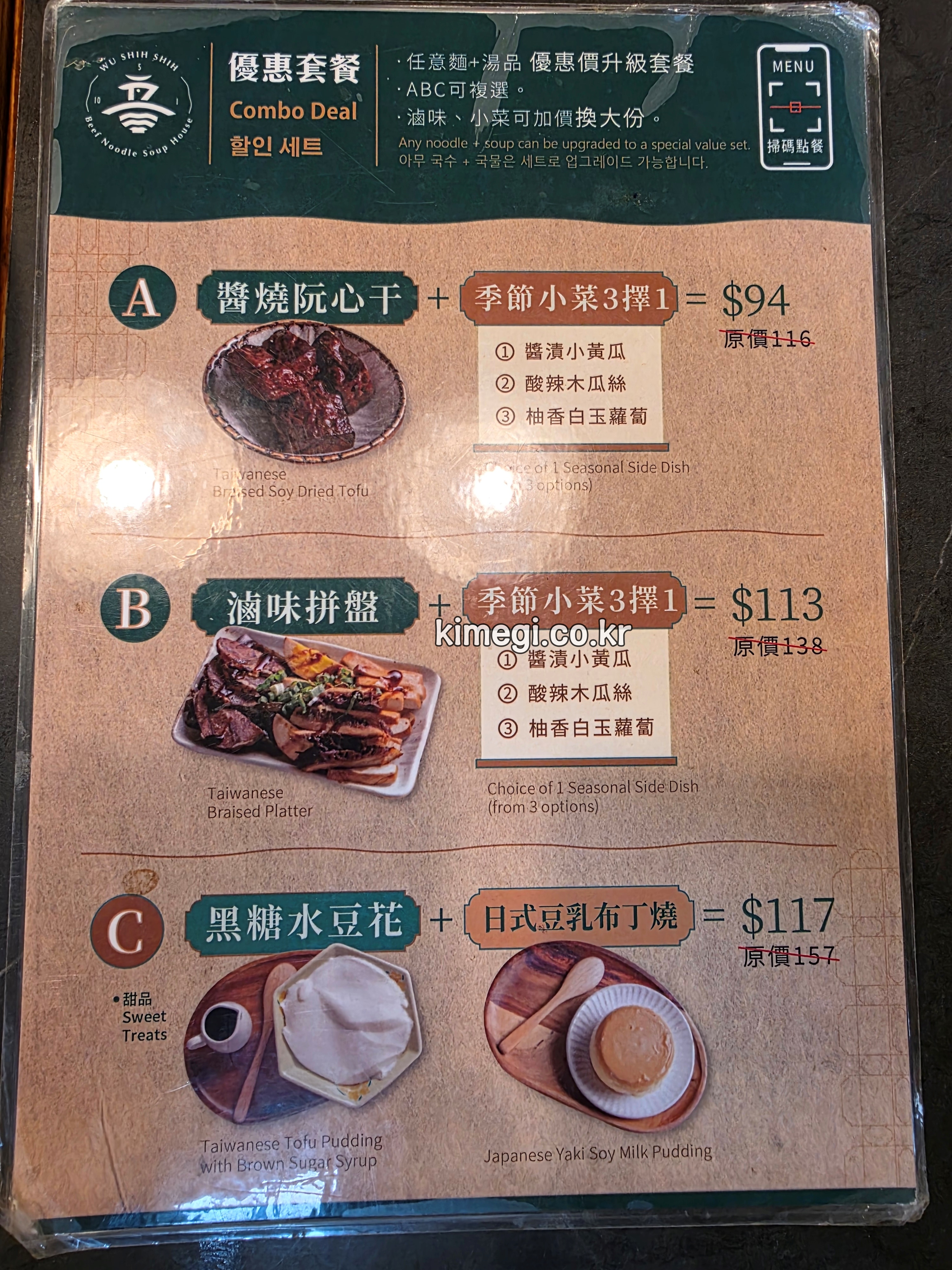 메뉴판은 QR코드로 확인할 수 있게 되어 있었고, 입구 쪽에 키오스크가 있어 주문을 직접 입력하면 됩니다. 메뉴는 꽤 다양했는데, 대표 메뉴인 우육면을 중심으로 마라 우육면, 홍샤오 우육면, 청탕 우육면, 그리고 우육 볶음면, 사이드 메뉴로는 오이지, 두부, 샐러드, 여러 종류의 고기 요리 등이 있었습니다. 세트메뉴도 따로 있어서, 혼자 방문하거나 가볍게 먹고 싶을 때는 세트 구성이 훨씬 편리해 보였습니다.