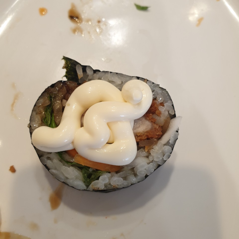 치킨마요에 뿌려먹으라고 나온 마요네즈를 김밥에 왕창 뿌려 먹어요.
