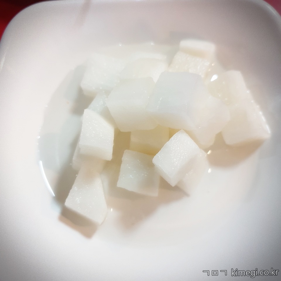 치킨에는 치킨무와 양배추 샐러드입니다.