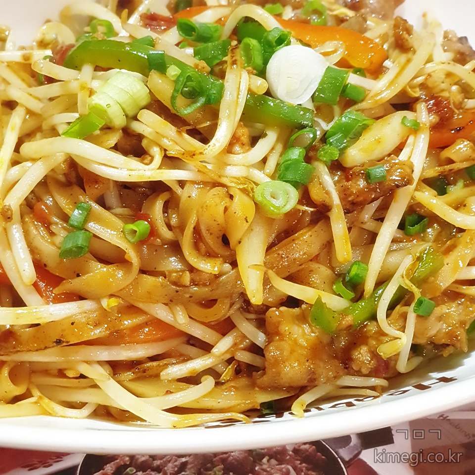 쌀국수 넓은 면에 숙주, 피망, 양파, 파 등이 들어가 있습니다.