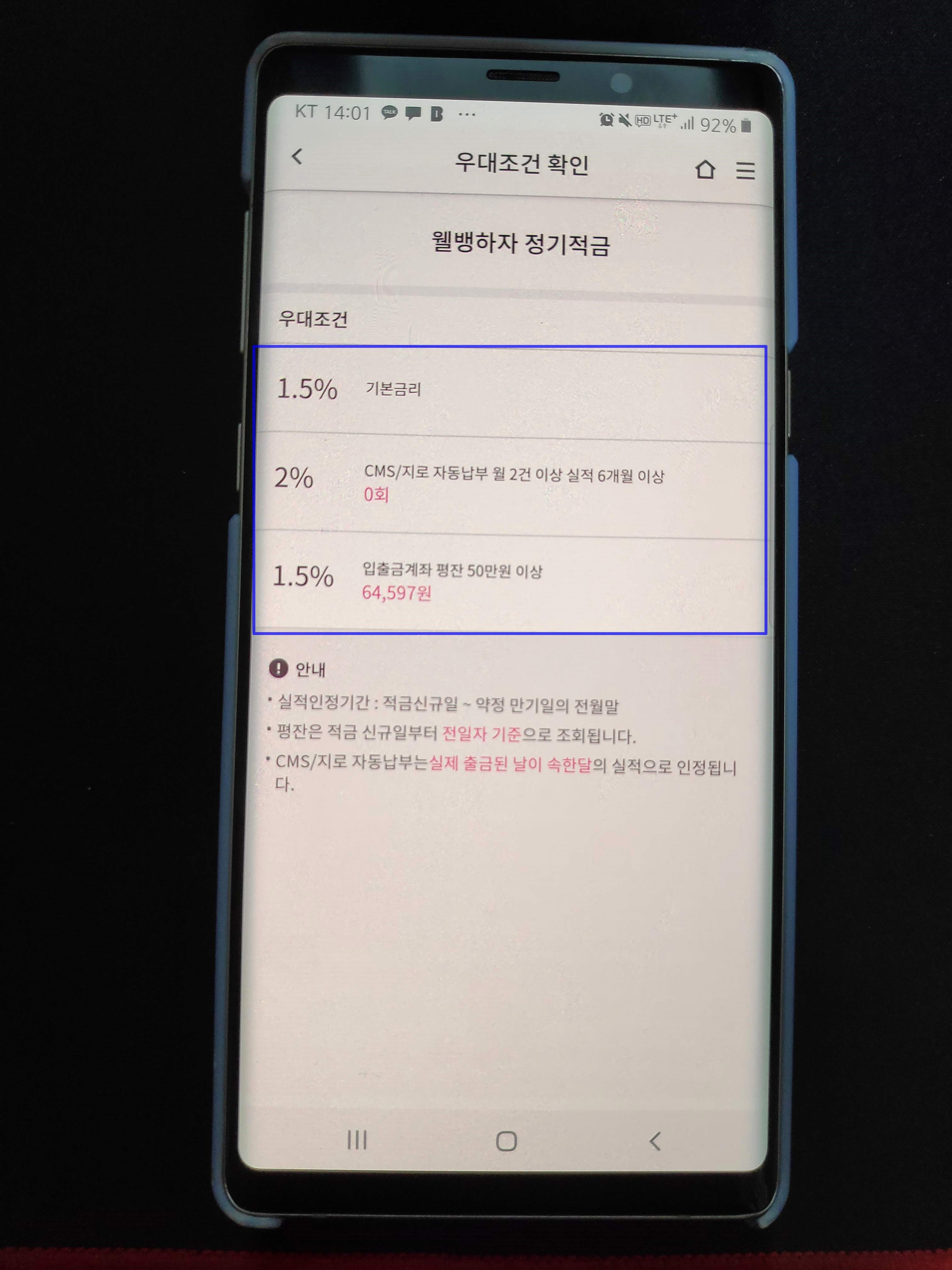 조건 2 : 입출금통장 평균 잔액 실적이 50만 원 이상인 경우 연 1.5%