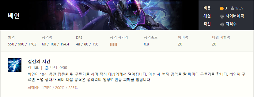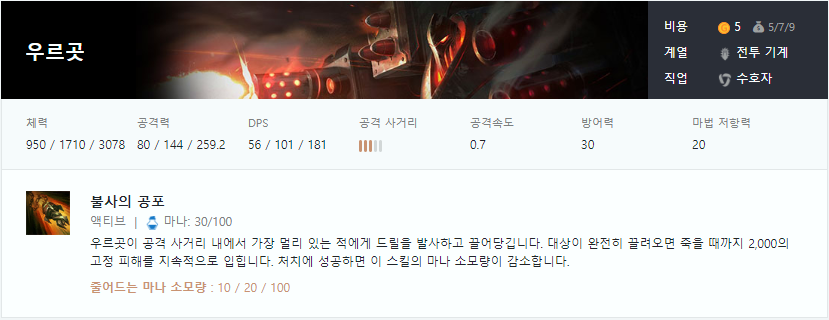 시너지 : 전투기계 챔피언은 피해를 10번 입히거나 받을 떄마다 현재 체력이 50%낮으면 체력을 회박하고 50%보다 높으면 가장 가꾸운 적에게 마법피해를 입힙니다.