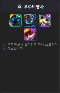 시너지 :(3) 우주비행사 챔피언은 마나 소모량이 30 감소합니다.
