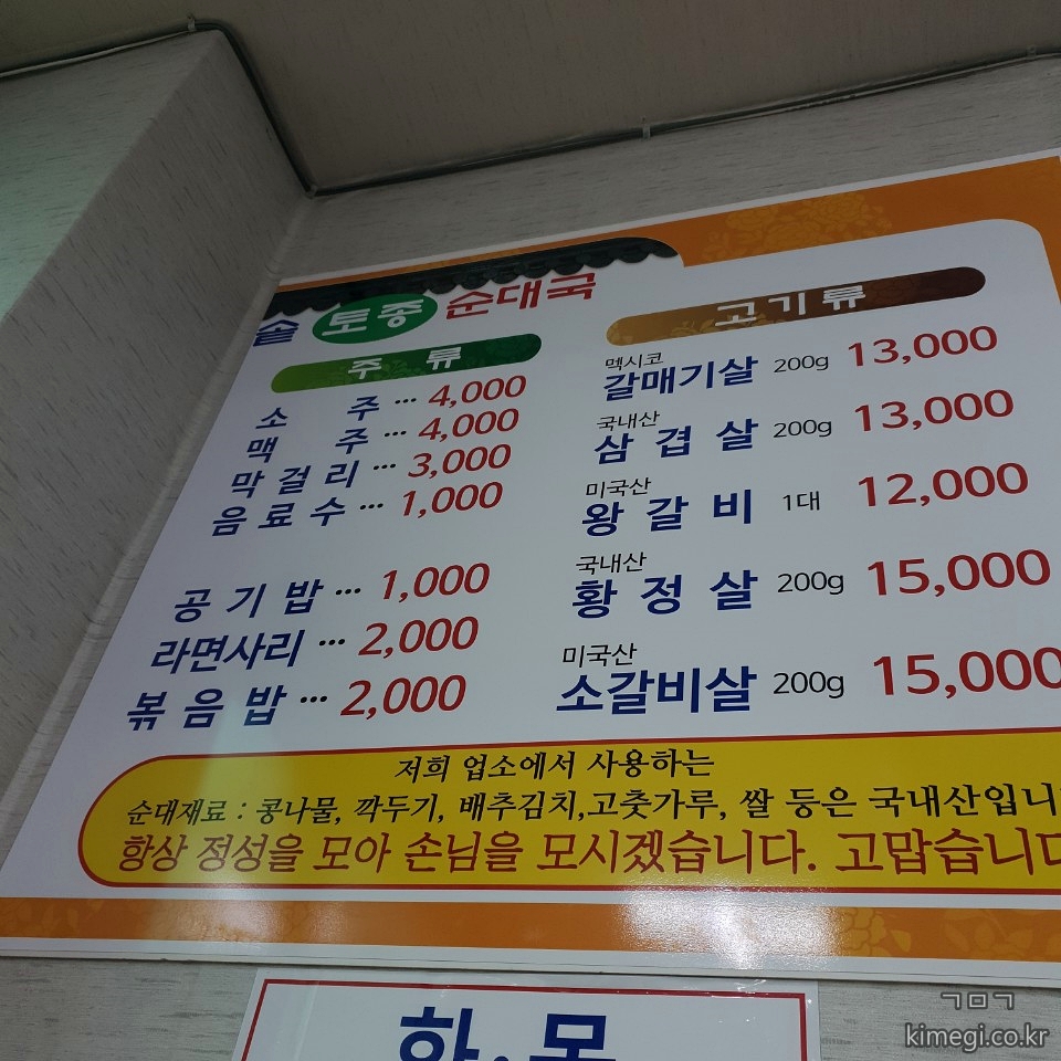 당진 가마솥 토종 순댓국집 메뉴판입니다.