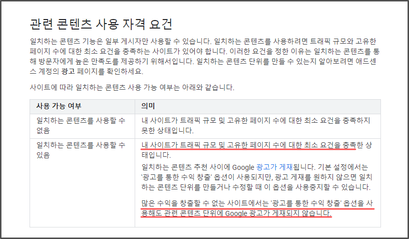 구글에서 말하는 일치하는 콘텐츠 사용 자격 요건은 '본인 사이트가 트래픽 규모 및 고유한 페이지 수에 대한 최소 요건을 충족한 상태'라고 합니다.