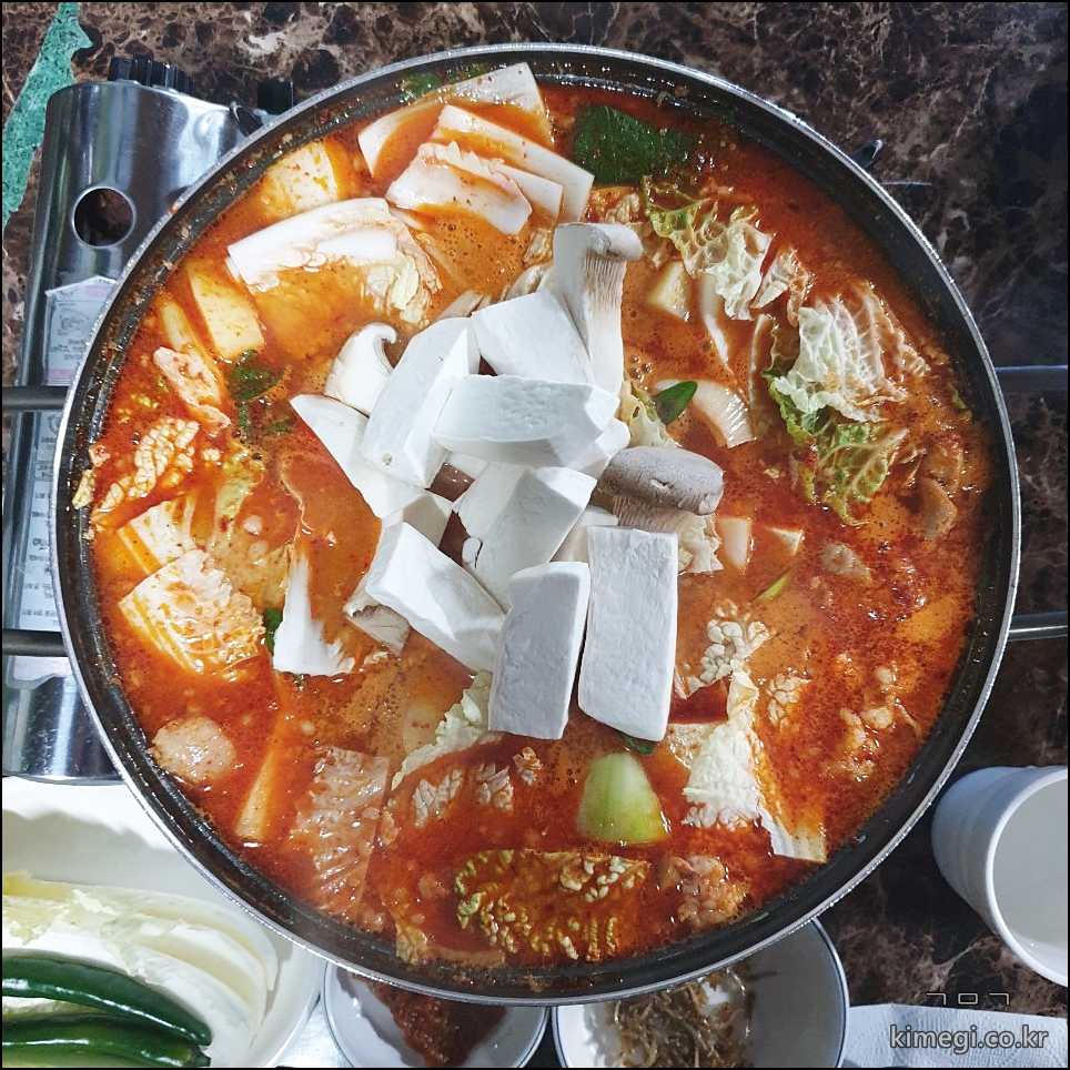 버섯, 두부, 배추, 양파 감자 등의 야채가 푸짐하게 들어가 있습니다.