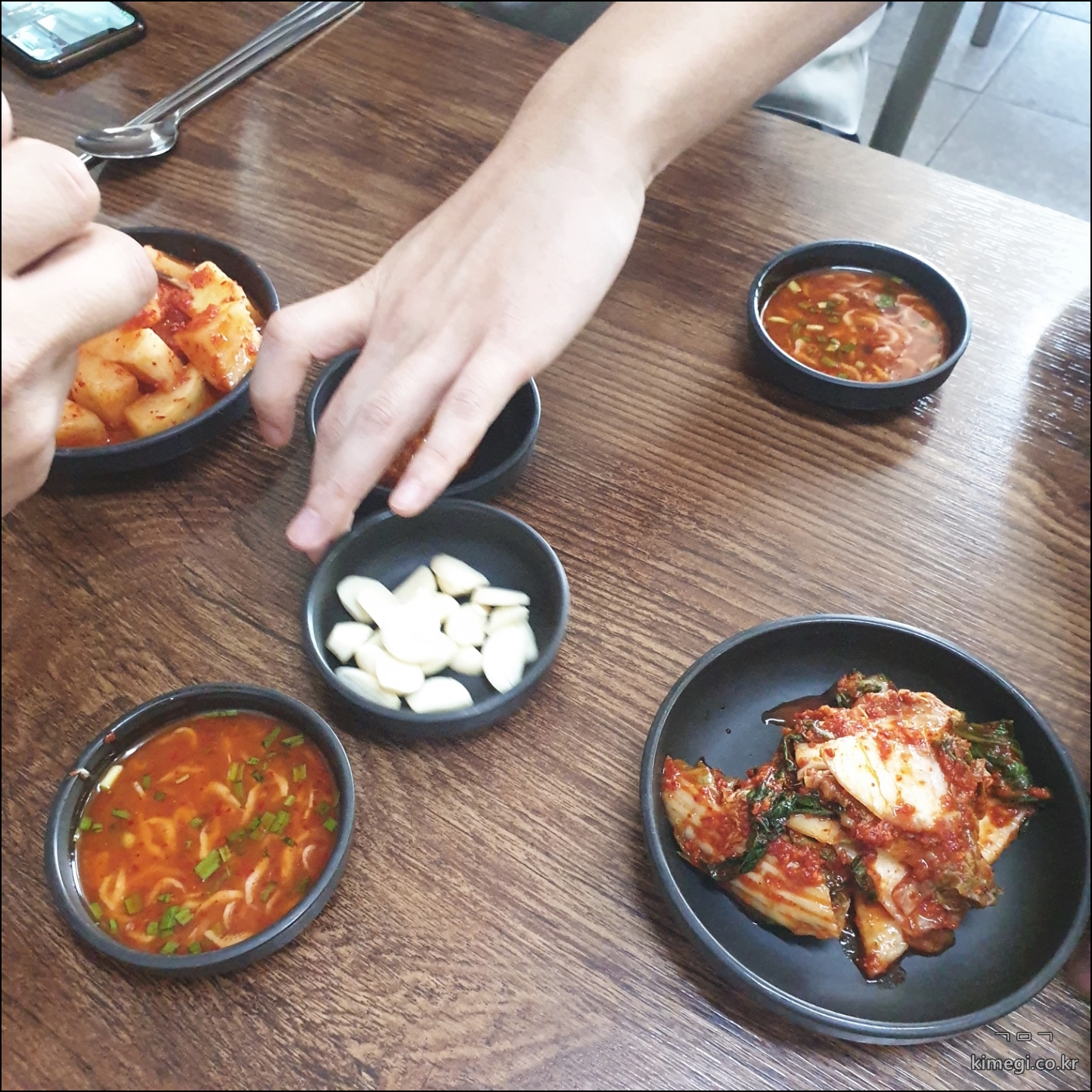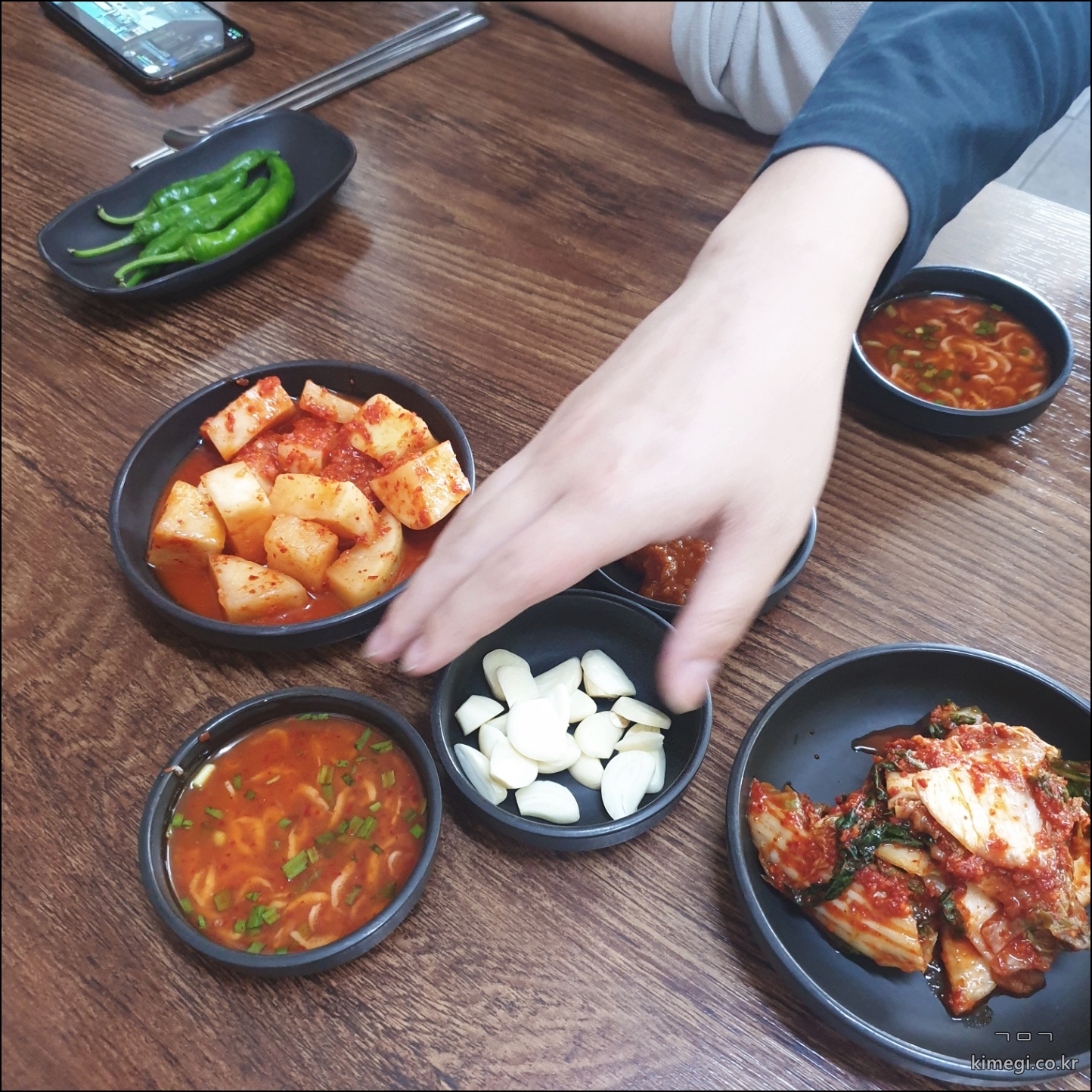 기본 반찬으로는 배추김치, 깍두기, 새우젓, 마늘, 고추가 나옵니다.
