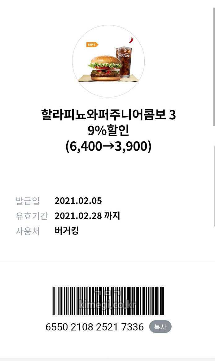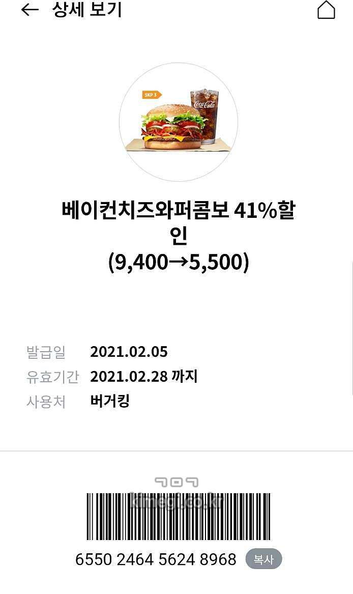 쿠폰을 다운로드하면 이렇게 쿠폰함에 버거킹 할인 바코드가 들어옵니다.