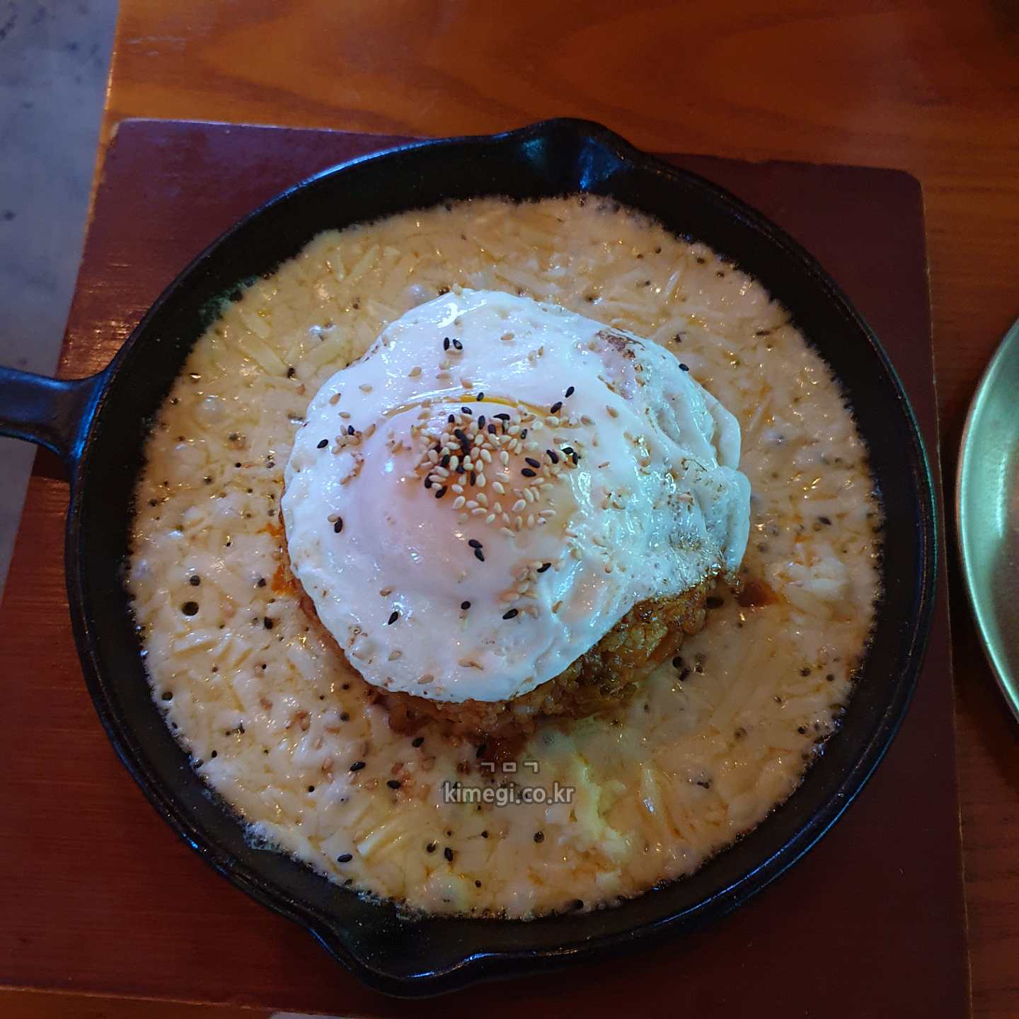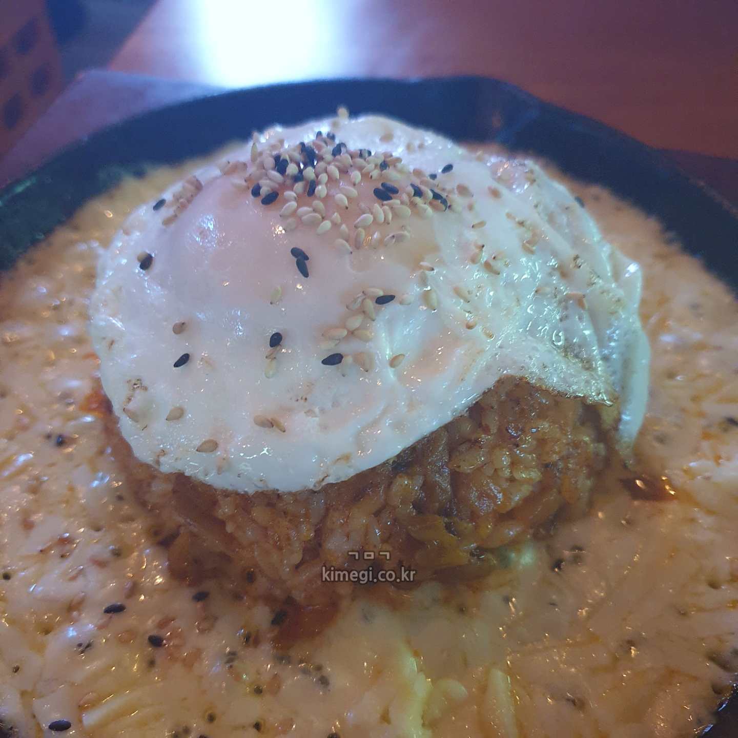 반숙 계란과 치즈가 정말 맛있어 보이는 김치볶음밥입니다.