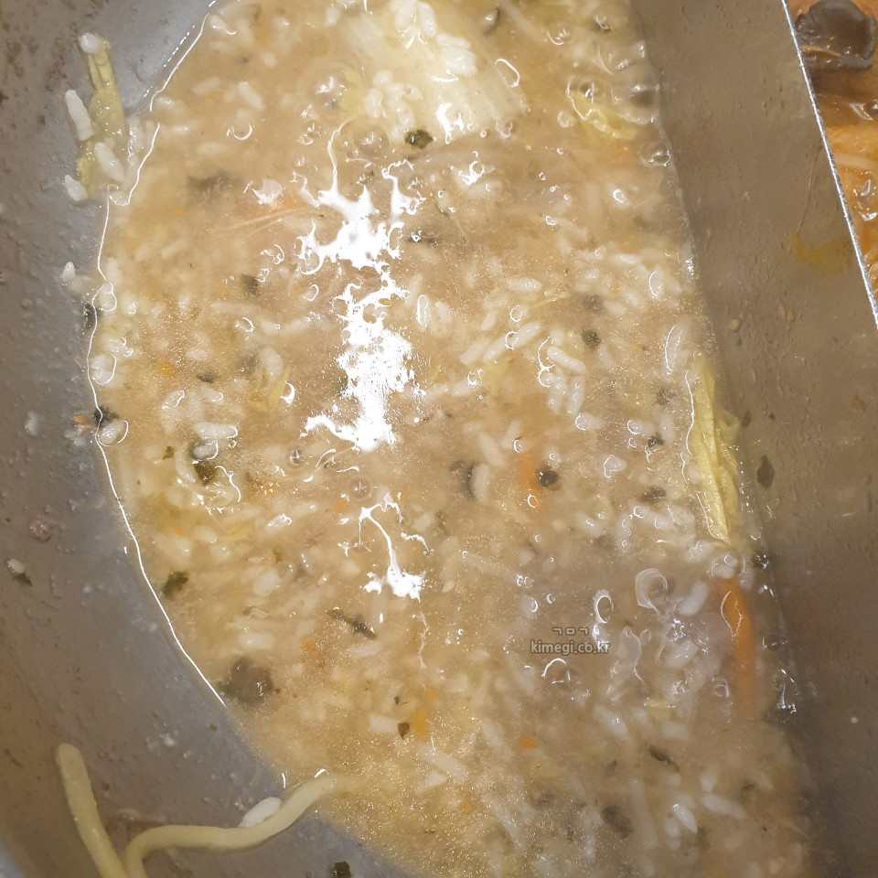 밥을 넣고 계란을 풀어서 국물이 다 없어질 때까지 저어주면 진짜 맛있는 죽이 됩니다.