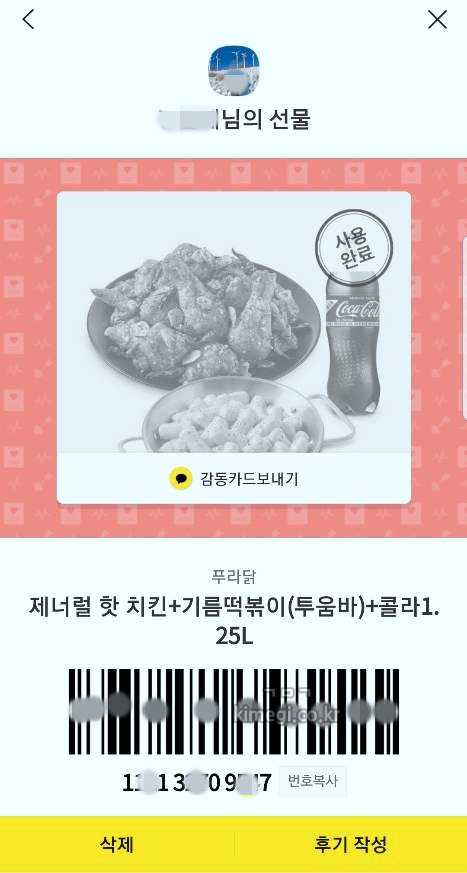 친구가 생일 선물로 준 푸라닭 카카오 선물을 사용할 수 있게 됐어요.