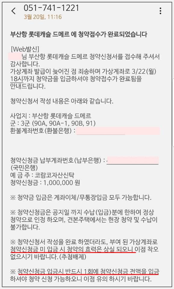 롯데 드메르 청약 신청금 납부 계좌번호가 안와서 걱정했는데 토요일에 왔습니다.