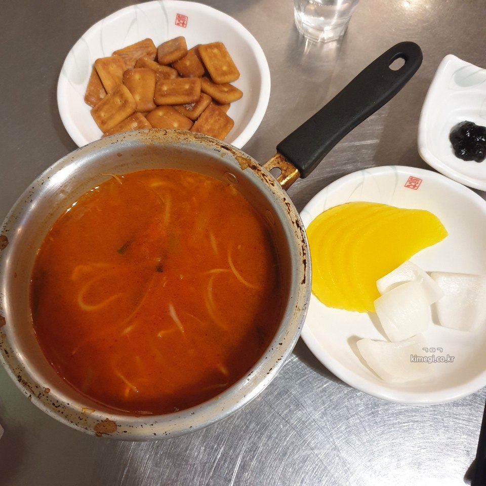 기본 안주로 건빵튀김과 짬뽕국물, 단무지가 나옵니다.