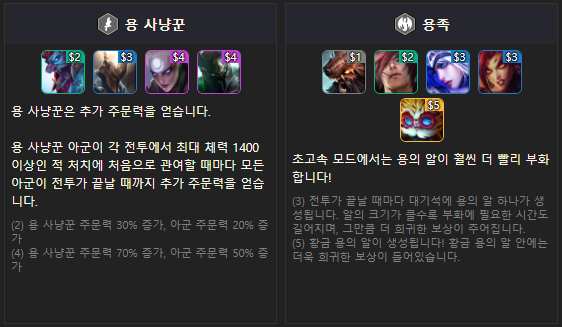 용 사냥꾼 아군이 각 전투에서 최대 체력 1400 이상인 적 처치에 처음으로 관여할 때마다 모든 아군이 전투가 끝날 때까지 추가 주문력을 얻습니다.