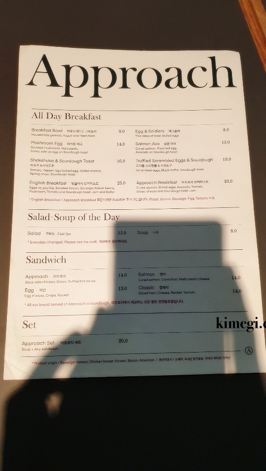 용산역 브런치 맛집 어프로치 메뉴판입니다. 조명 때문에 그림자 져서 사진이 잘 안 나왔네요. 가격은 조금 비싼 편입니다. 친구가 사는 거니까 이렇데 와서 먹지 남자끼리는 절대 올리 없는 곳이에요.