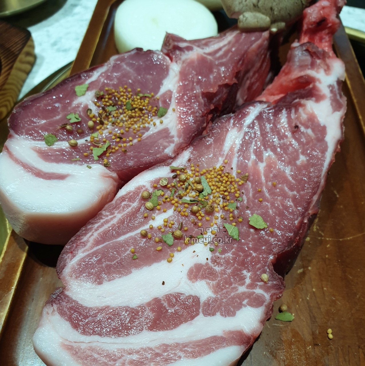 직원분이 더 맛있게 찍으라고 할 정도로 뭔가 멋져요. 만화 고기라고 만화에서 먹는 그런 고기 같아요. 그래서 요즘 캠핑을 가거나 놀러 갈 때 토마호크를 만화 고기라고 해서 가져가는 분들이 많더라고요. 돼지고기도 어깨 부위를 이렇게 잘라서 먹을 수 있더라고요.