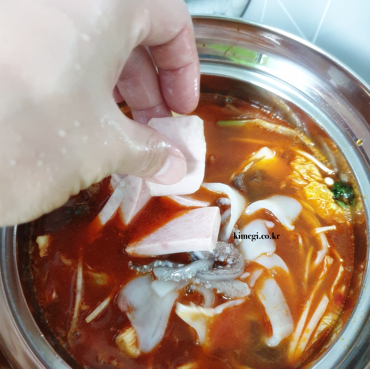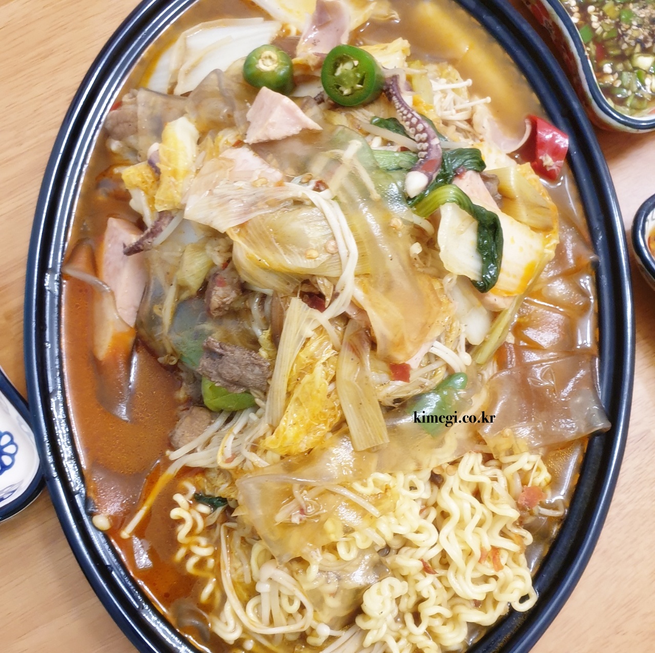 더 큰 냄비로 옮겨준 다음에 햄과 오징어, 당면, 분모자를 넣어줍니다. 소시지, 만두, 옥수수 면 등 어떤 것을 넣어도 마라탕의 향이 베어서 정말 맛있습니다. 저는 라면을 넣어주었어요. 항상 실수하는 것이 양 조절입니다. 이것도 넣고 저것도 넣다 보니 냄비가 넘칠 것 같더라고요. 그래서 밥을 같이 먹으려다가 밥은 포기했어요.