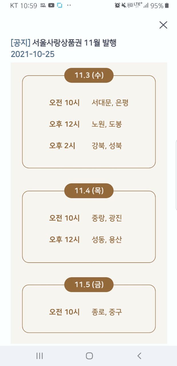 10% 할인된 가격으로 주변 마트, 식당, 미용실 등을 이용할 수 있는 상품권을 매일 구매할 수가 없습니다. 21년 하반기 서울사랑 상품권을 11월 1일부터 순차적으로 판매하고 있습니다. 접속자가 많아 시간대 별로 지역마다 판매를 하고 있어요.