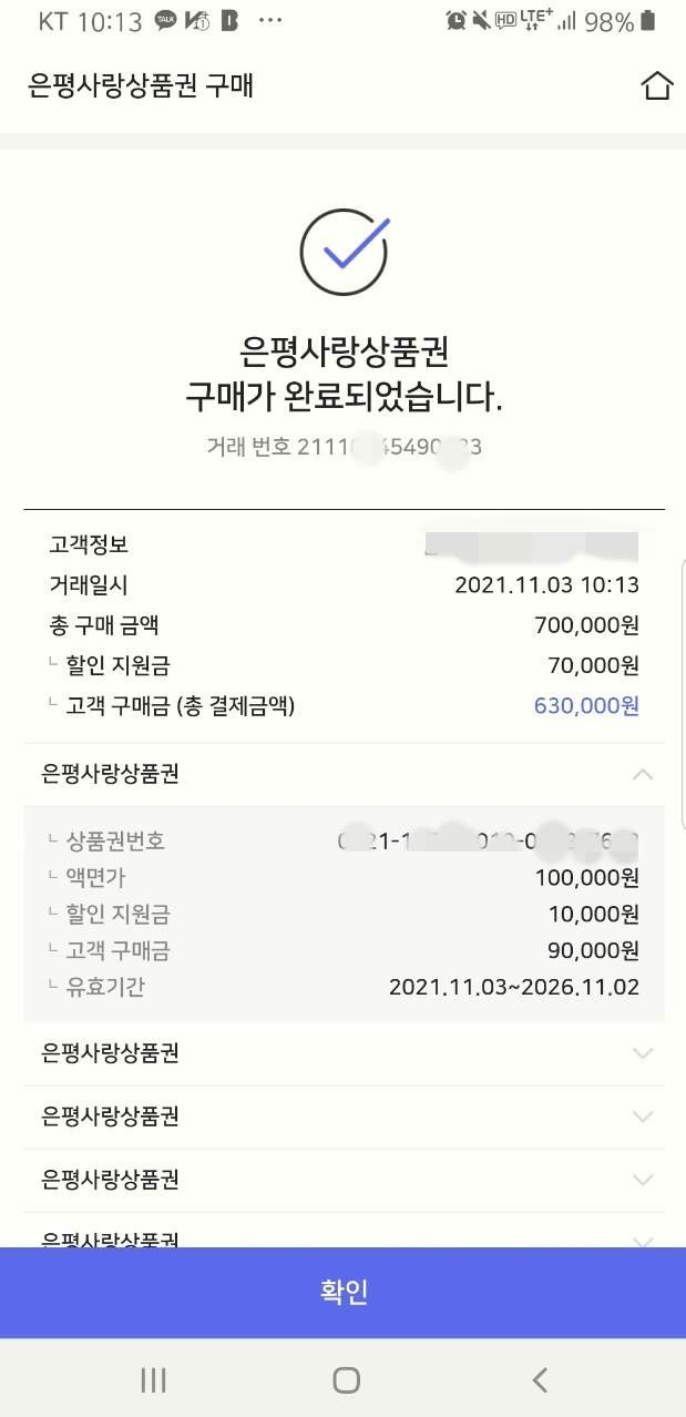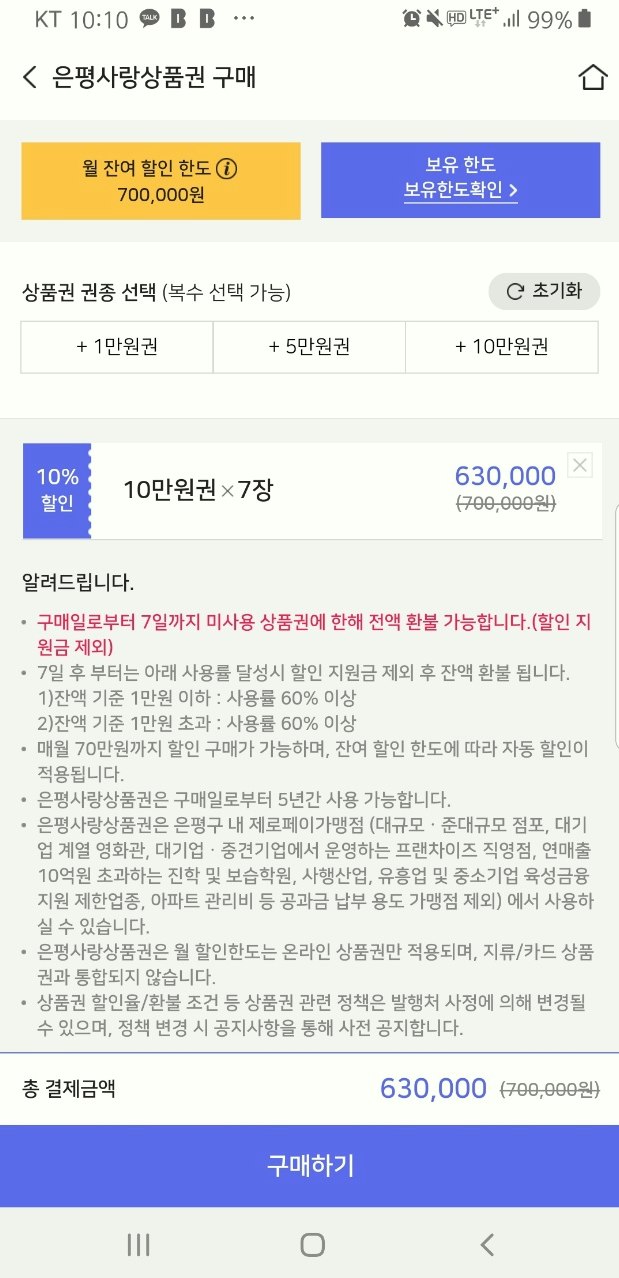 1인이 월 구매 가능 금액은 70만 원입니다. 70만원 상품권을 63만 원에 구매할 수 있어 10% 할인을 받은 셈입니다. 지난번 3분기 때 구매한 상품권은 거의 다 사용해서 20만 원 정도 남았어요. 미용실에서도 사용 가능해서 여성분들은 클리닉이나 시술 한번 받으면 70만 원은 금방 사용할 수 있을 것 같아요.