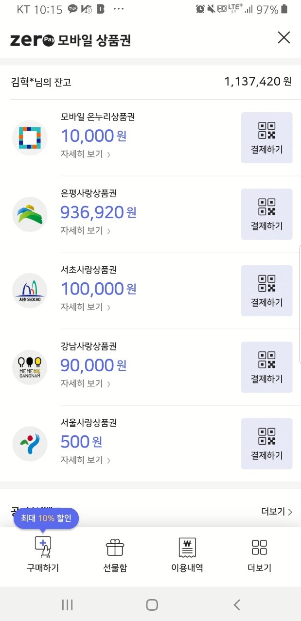 저는 그래서 매일 들어가서 환불된 상품권이 있으면 구매를 해놓아요. 서초나 강남은 언젠가는 가서 이용하기 때문에 발행만 되면 무조건 구매하고 있습니다. 이제 코로나 모임 제한도 풀려 약속도 많아질 것 같은데 약속은 거의 강남에서 하기 때문에 잘 이용할 수 있을 것 같아요. 제가 제로 페이로 계산한 뒤에 1/N 돌려받으면 현금화도 할 수 있고 다양하게 이용할 수 있는 방법이 많습니다. 카페, 마트, 음식점 등 정말 많은 곳에서 사용할 수 있어 너무 좋습니다.