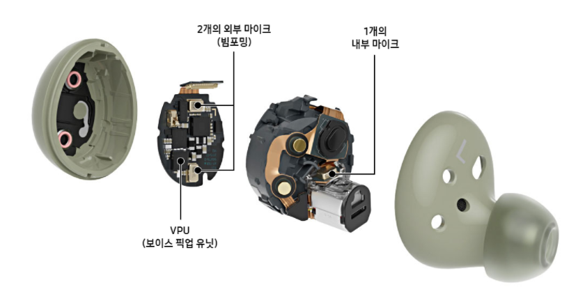 갤럭시 버즈 1을 사용해 보신 분들은 공감하실 내용입니다. 버즈 1은 통화음질이 정말 안 좋습니다. 제가 듣는 것은 괜찮은데 상대방이 내 목소리를 잘 못 알아 들어서 정말 크게이야기를 해야 해요. 갤럭시 버즈 2에서는 통화 음질이 개선되어서 출시되었습니다. 2개의 외부 마이크와 보이스 픽업 유닛, 1개의 내부 마이크를 통해서 통화음질을 확실히 개선했어요.