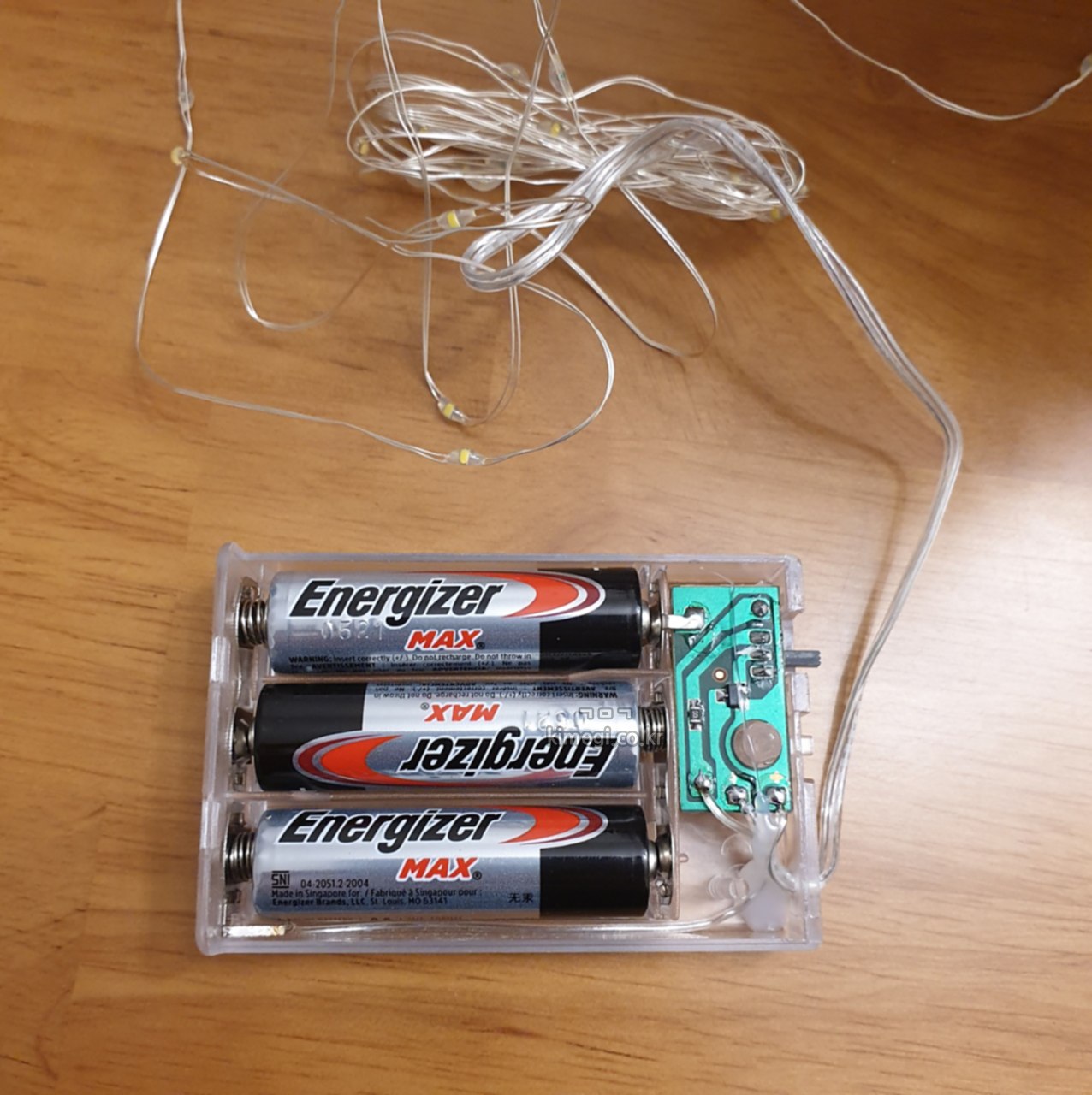 장신구를 다 달았으면 전구를 둘러주면 됩니다. 건전지는 동봉되어 있지 않으니 추가로 구매하셔야 해요. 저는 건전지로 전구를 밝혀서 더 좋았어요. 따로 콘센트에 전원을 연결하면 테이블에 올려놓기 지저분했을 텐데 건전지라 깔끔하더라고요.