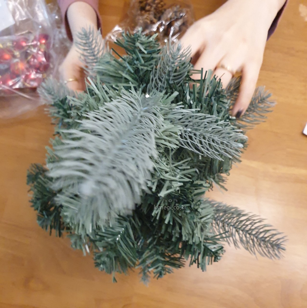 말려온 트리의 입을 풍성하게 펴주는 작업부터 시작합니다. 크게 어렵지 않은 작업이에요. 가격이 저렴하다 보니까 잎이 많지 않아서 그렇듯 하게 펼쳐주어야 하는 것이 가성비 트리의 핵심 작업입니다. 잘 펴주면 이렇게 풍성한 트리 모양이 완성됩니다.