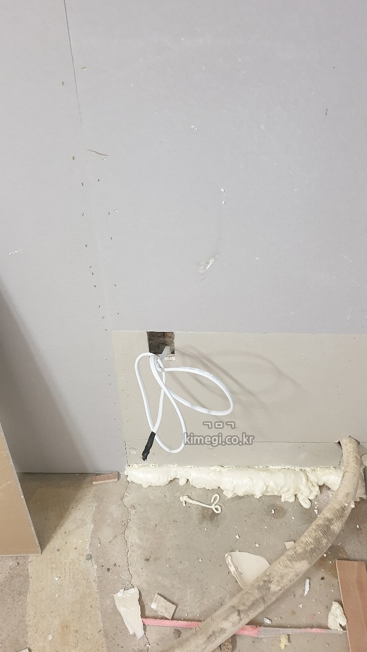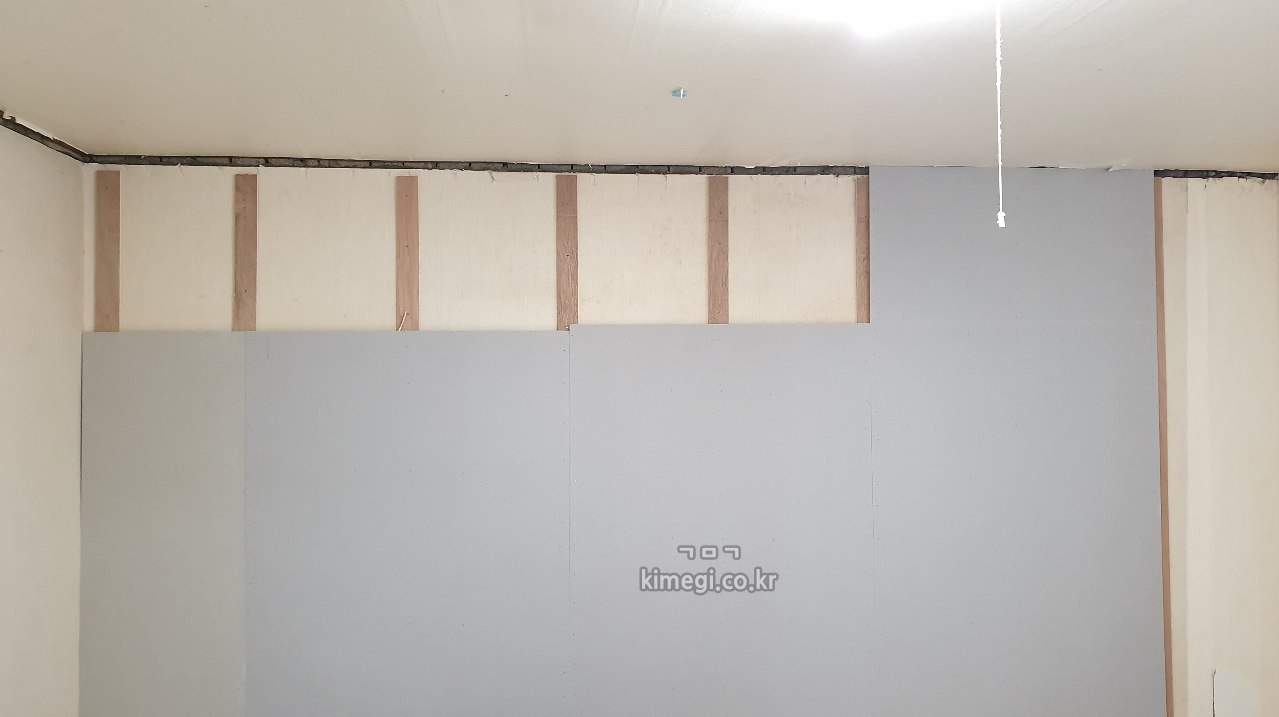 이렇게 석고보드를 댄 안방은 몰딩을 하기 전에 석고보드가 뚫린 몰딩 자리를 커버 쳐주어서 도배를 해도 깔끔합니다.