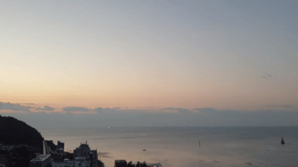 미포항 뷰는 아침에 일출을 볼 수 있습니다. 조식도 먹고 일출도 볼 겸 일찍 일어나서 일출을 보면서 일어났어요. 구름이 껴서 동그란 태양을 보지 못한 게 아쉽네요.