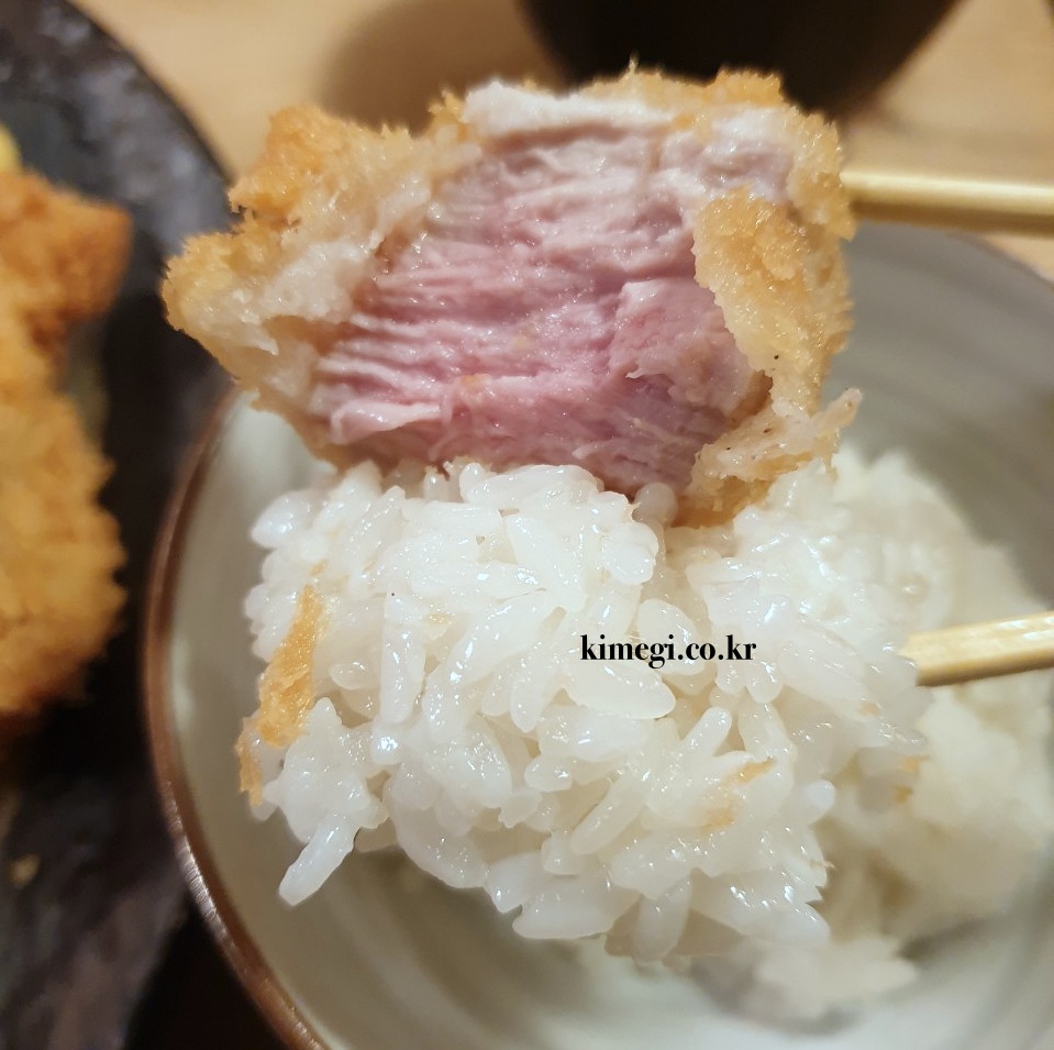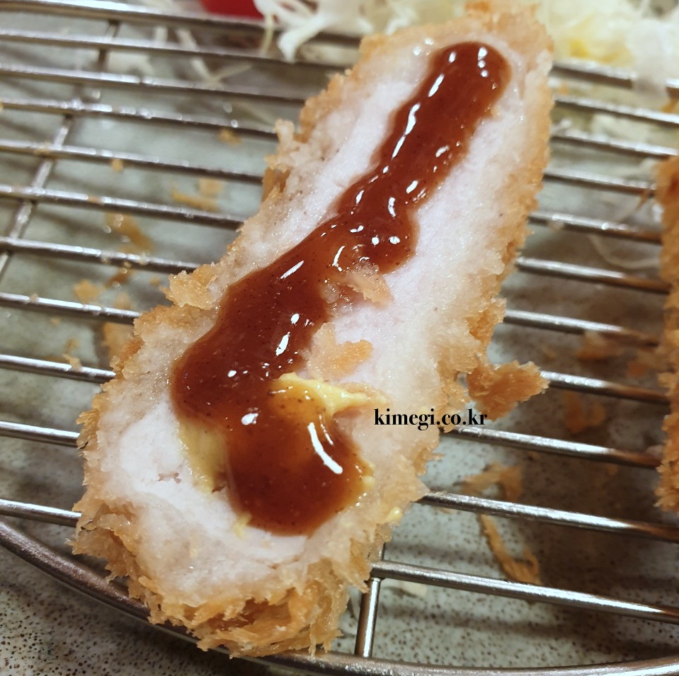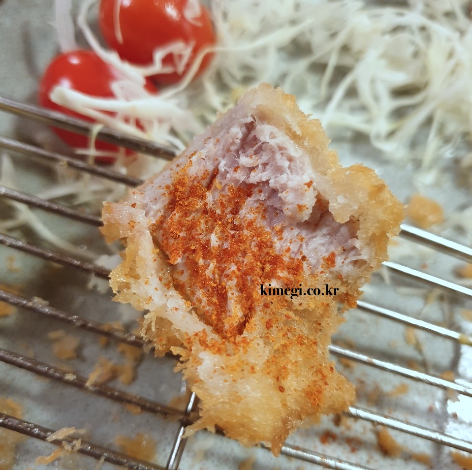 육즙을 가득 머금고 있어서 전혀 퍽퍽하지 않고 부드럽습니다. 기름기는 적고 부드럽고 담백합니다. 튀김옷의 고소함과 정말 잘 어울리는 것 같아요.