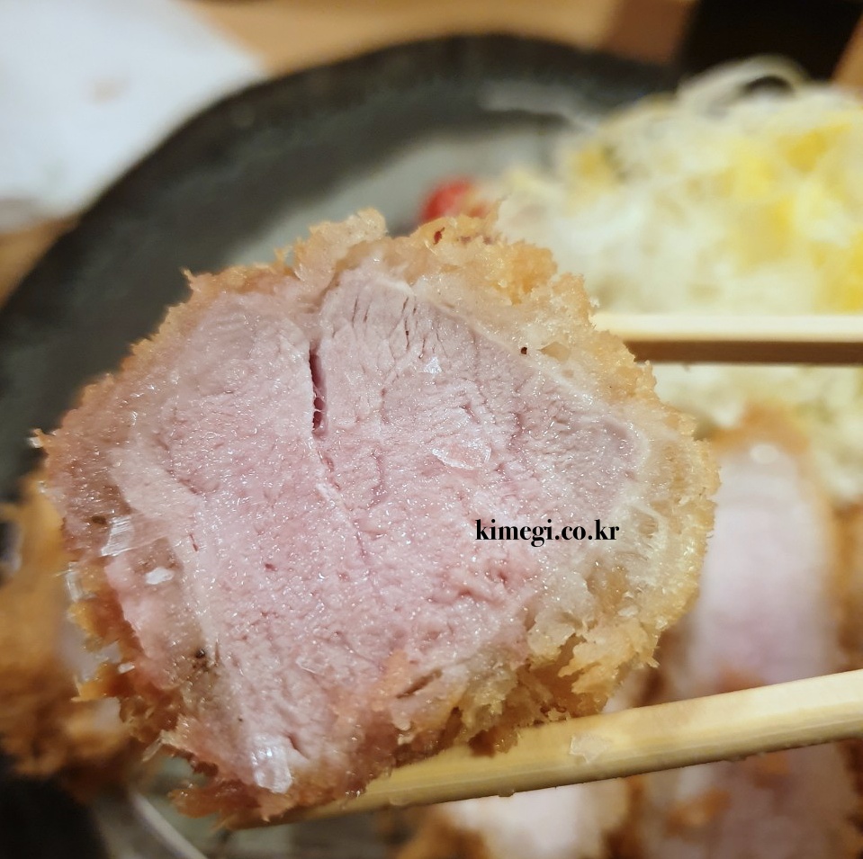 톤쇼우의 히레카츠는 핑크빛의 안심이 정말 먹음직스럽습니다. 저는 퍽퍽살보다는 기름진 부위를 좋아해서 주로 등심을 먹는데 톤쇼우의 안심은 정말 부드러웠습니다. 핑크빛이 날 정도로 익혀주는 것이 가장 부드럽고 맛있게 먹을 수 있는 방법이래요.