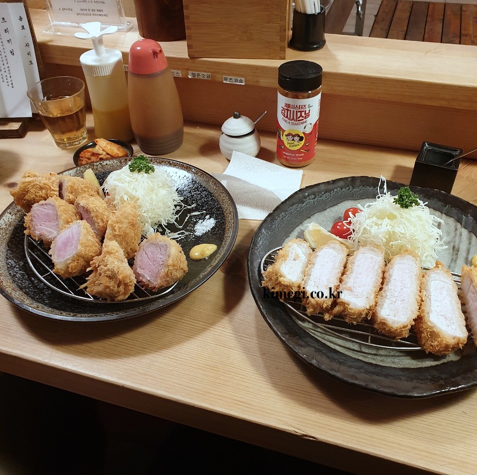 로스카츠(10,500원), 히레카츠(11,500원)를 주문했습니다. 칸쥬쿠카츠라고 얇게 썰어서 튀긴 돈카츠가 맛있다고 합니다. 저는 주문할 때 뒤에서 대기를 하고 있어서 미리 찾아보지 못해서 기본적인 등심과 안심 돈카츠를 주문했어요. 미리 주문을 해서 그런지 수프를 다 먹으니 메인 메뉴가 나왔습니다. 왼쪽이 안심으로 만든 히레카츠, 오른쪽이 등심으로 만든 로스카츠입니다.