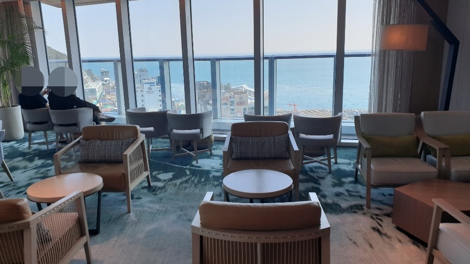 저희는 체크인을 하고 조금 쉬다가 바로 라운지로 갔습니다. 얼리 체크인을 하고 가서 그런지 사람들이 별로 없었어요. 바다가 잘 보이는 곳에 자리를 잡았습니다. 바다는 미포항과 블루라인을 바라보는 뷰입니다.