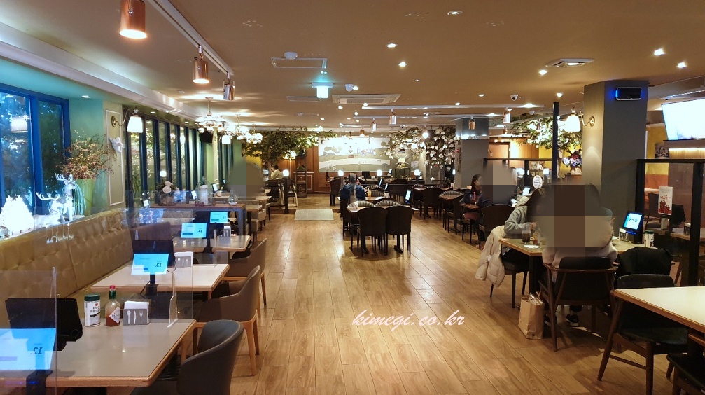 이재모 피자 가게 내부가 정말 넓어요. 분위기는 옛날 비싼 경양식집 느낌이랄까? 저는 경양식집을 가본 적은 없고 티브이에서 본 그런 느낌이에요. 뭔가 엄청 고급스럽게 만든 한국식 피자집이랄까? 오래된 곳이라서 그런지 할머니 할아버지 손님들도 많았어요. 그래서 뭔가 인테리어는 크리스마스 느낌인데 한국적인 느낌이 많이 들더라고요.