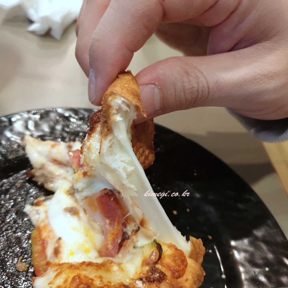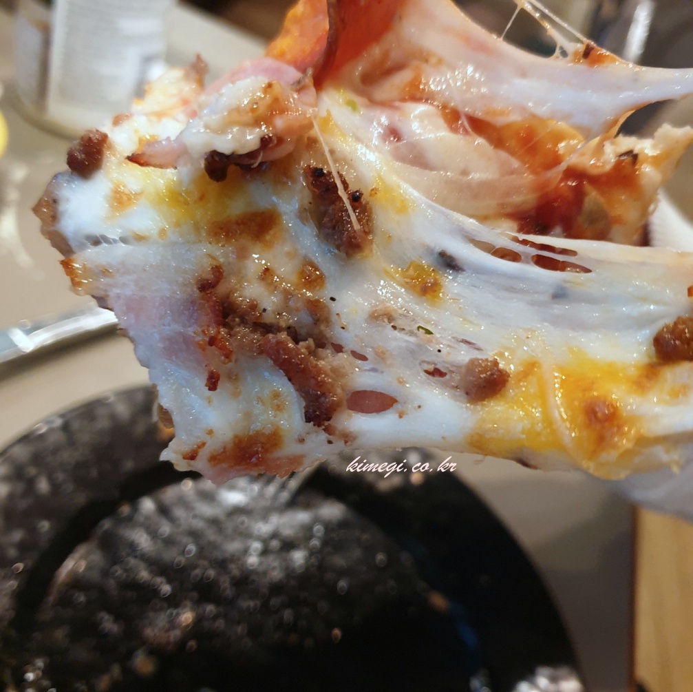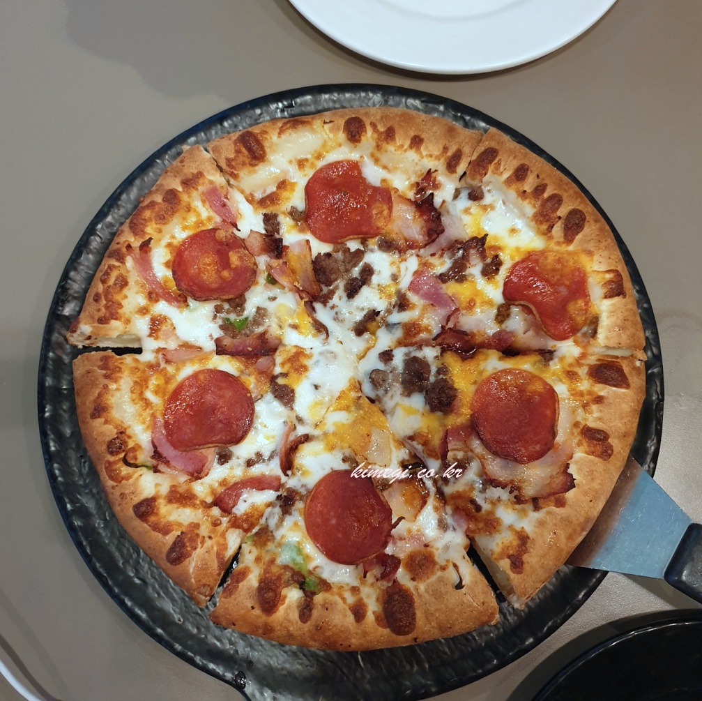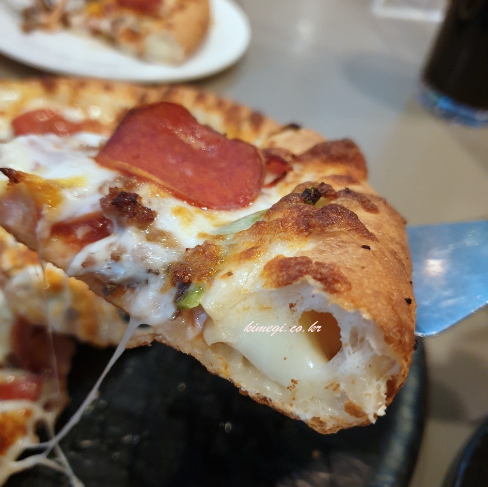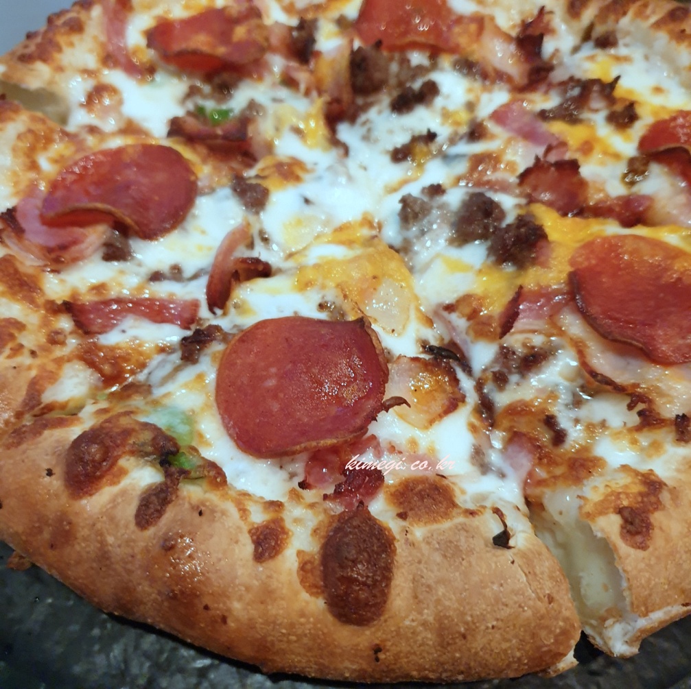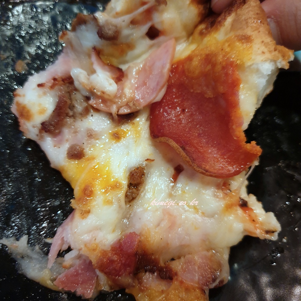 임실치즈를 사용해서 그런지 치즈향이 정말 고소했어요. 페퍼로니와 베이컨이 푸짐하게 올려져 있어요.