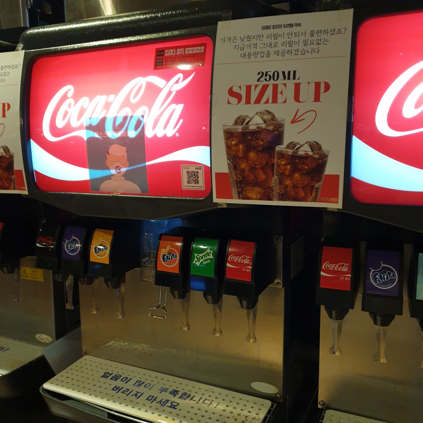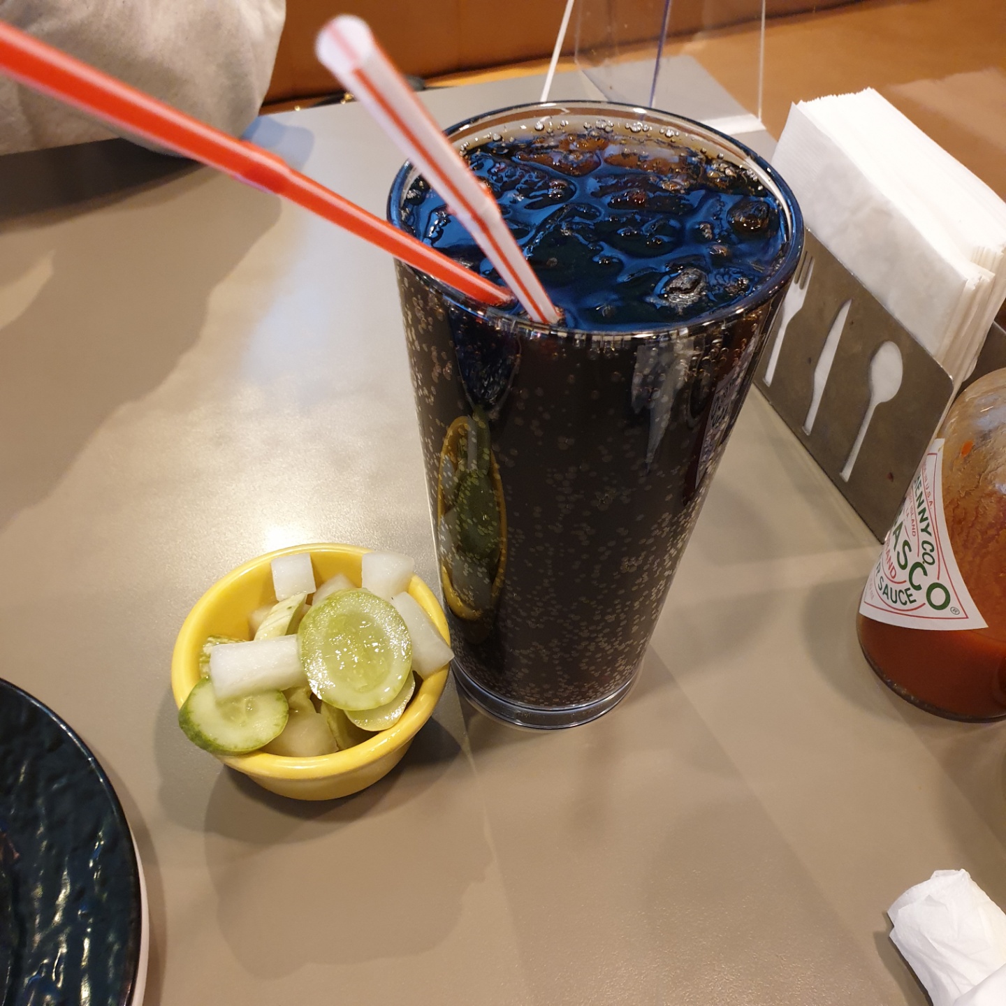 콜라와 피클은 셀프고 콜라는 리필이 안된다고 해요. 그런데 1잔 컵이 정말 커서 리필을 할 필요가 없더라고요. 피클도 오이값이 비싸다고 적어놓고.. 그런 점은 조금 불편했어요. 저는 음식 남기는 걸 싫어하는 편이긴 한데 너무 강요하는 느낌?
