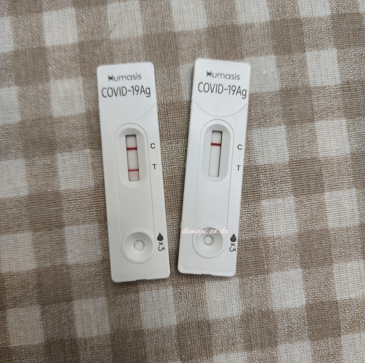 출근 후에도 목상태가 점점 안 좋아지는 것 같아서 또 자가 키트를 해보았지만 음성이었어요. 물론 두 번 다 코에 깊숙이 찌르고 검사를 했었습니다. 그러다가 목으로 하면 더 정확하다는 이야기를 듣고 자가 키트를 목에다 추가로 해보았더니 두줄 양성이 나왔어요.
