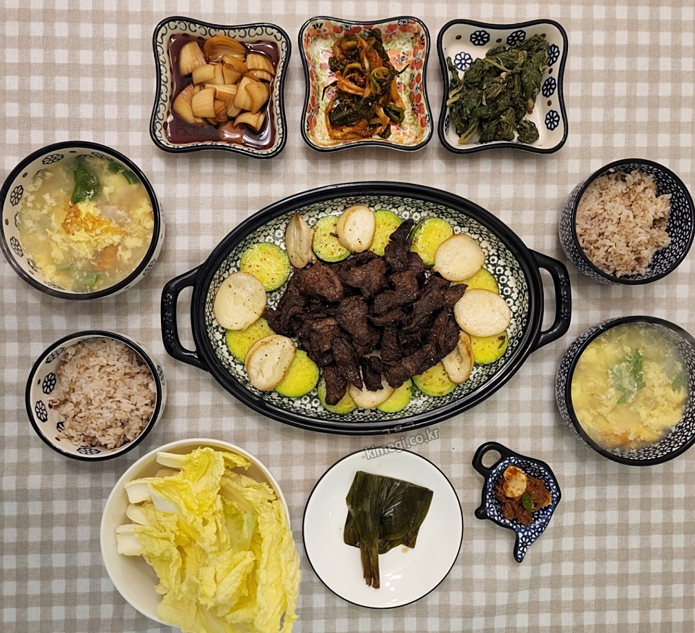 부모님이 주신 반찬들과 함께 상을 차리면 저녁식사가 끝났습니다. 정말 간단히 만들었지만 푸짐한 한상이 되었어요. 고기는 에어 프라이기로 굽고 야채 살짝 굽고 계란탕 후딱 하니까 정말 푸짐해졌습니다.