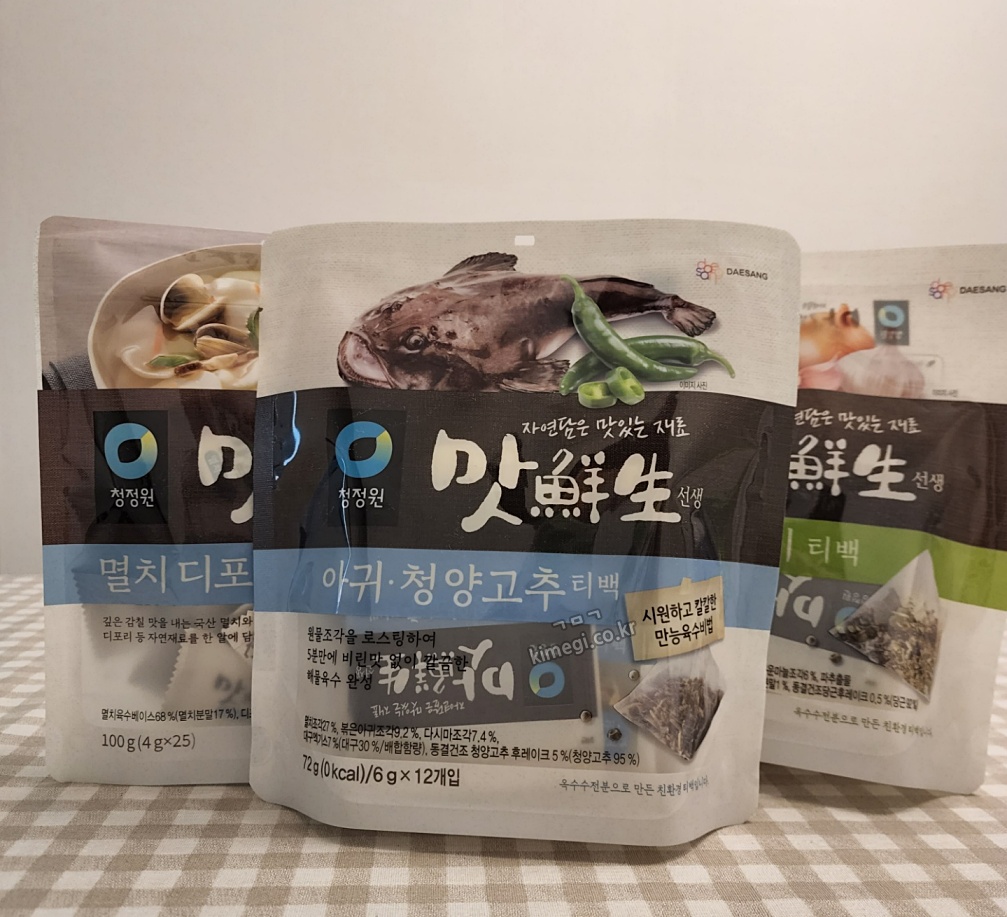 청정원 맛선생만 있으면 국물 육수를 만들기 정말 쉬워요. 멸치 육수 내고 야채 육수 내려면 정말 골치 아픈데 가격도 저렴하고 간편해서 요즘 모든 국물 요리는 알 육수를 사용해서 만들고 있어요. 청정원 맛선생에는 멸치 디포리 알 육수뿐만 아니라 아귀 청양고추, 채소 육수 팩도 있어서 만들려는 음식에 따라 사용하고 있어요.