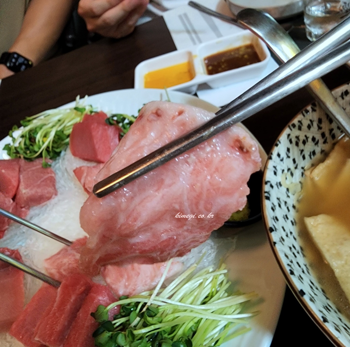 리필하는 참치도 이렇게 양이 많고 부위가 바뀌지 않아요. 초반에는 소금이나 간장에 찍어서 먹다가 양이 너무 많고 조금 느끼해서 나중에는 김에 싸 먹게 되더라고요. 해방 일지에서 참치는 김에 싸 먹는 게 아니라고 하지만 어쩔 수 없습니다. 참치를 한 점이라도 더 먹으려면 김이 필수입니다.
