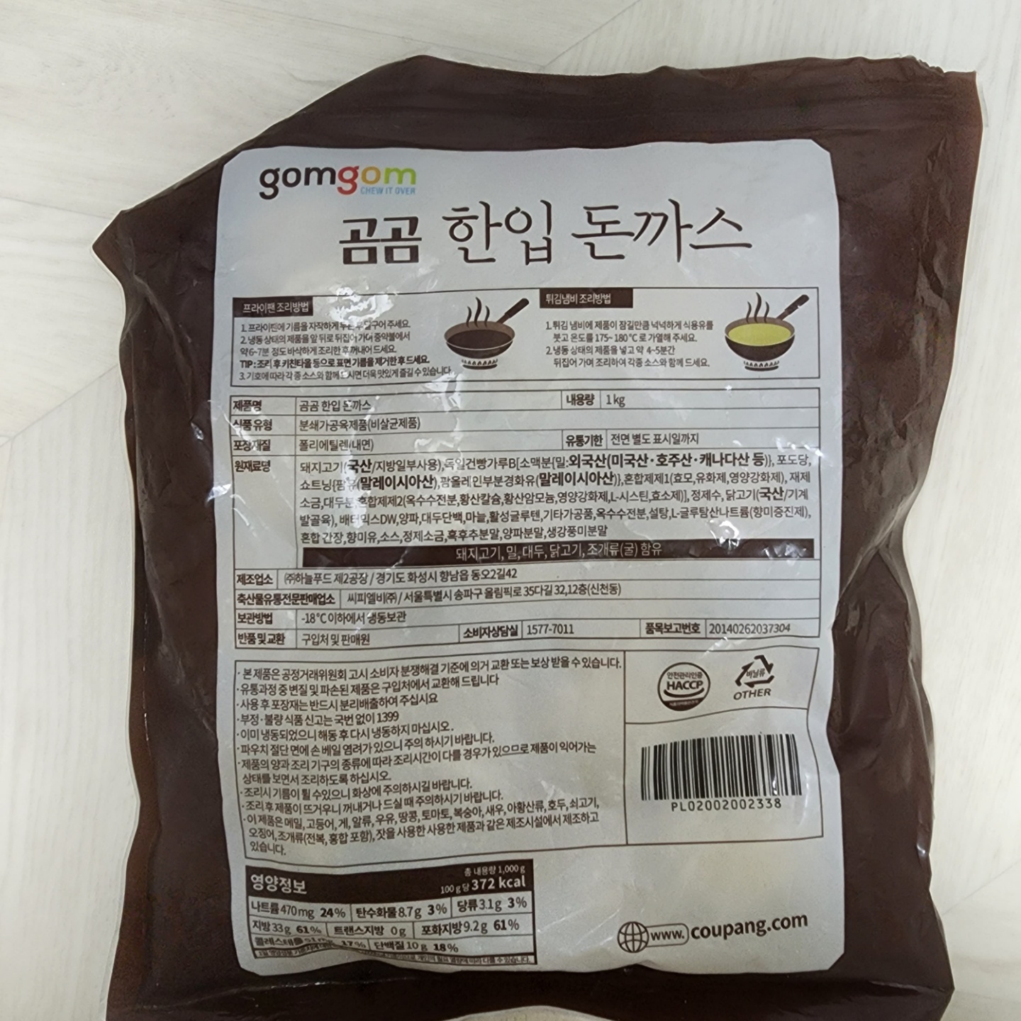 곰곰 한입 돈가스는 가격도 1kg에 5,800원으로 정말 저렴해요. 곰곰 브랜드는 저렴한 상품들이 많아서 자주 애용하는 브랜드예요. 양이 많아도 냉동실에 넣어서 보관하면 되기 때문에 좋더라고요. 냉동식품이 진짜 간편하게 먹을 수 있는 간편 반찬인 것 같아요.